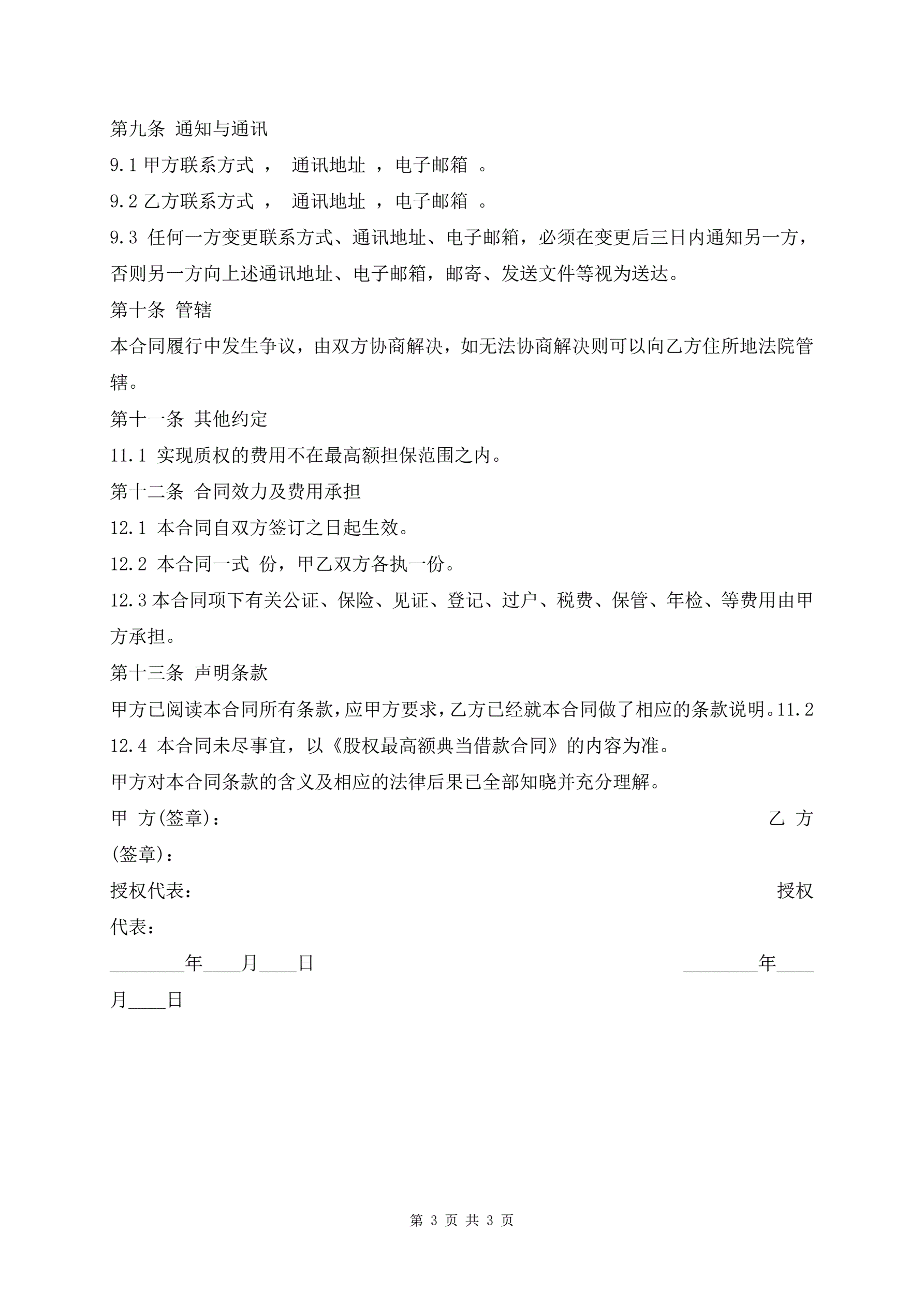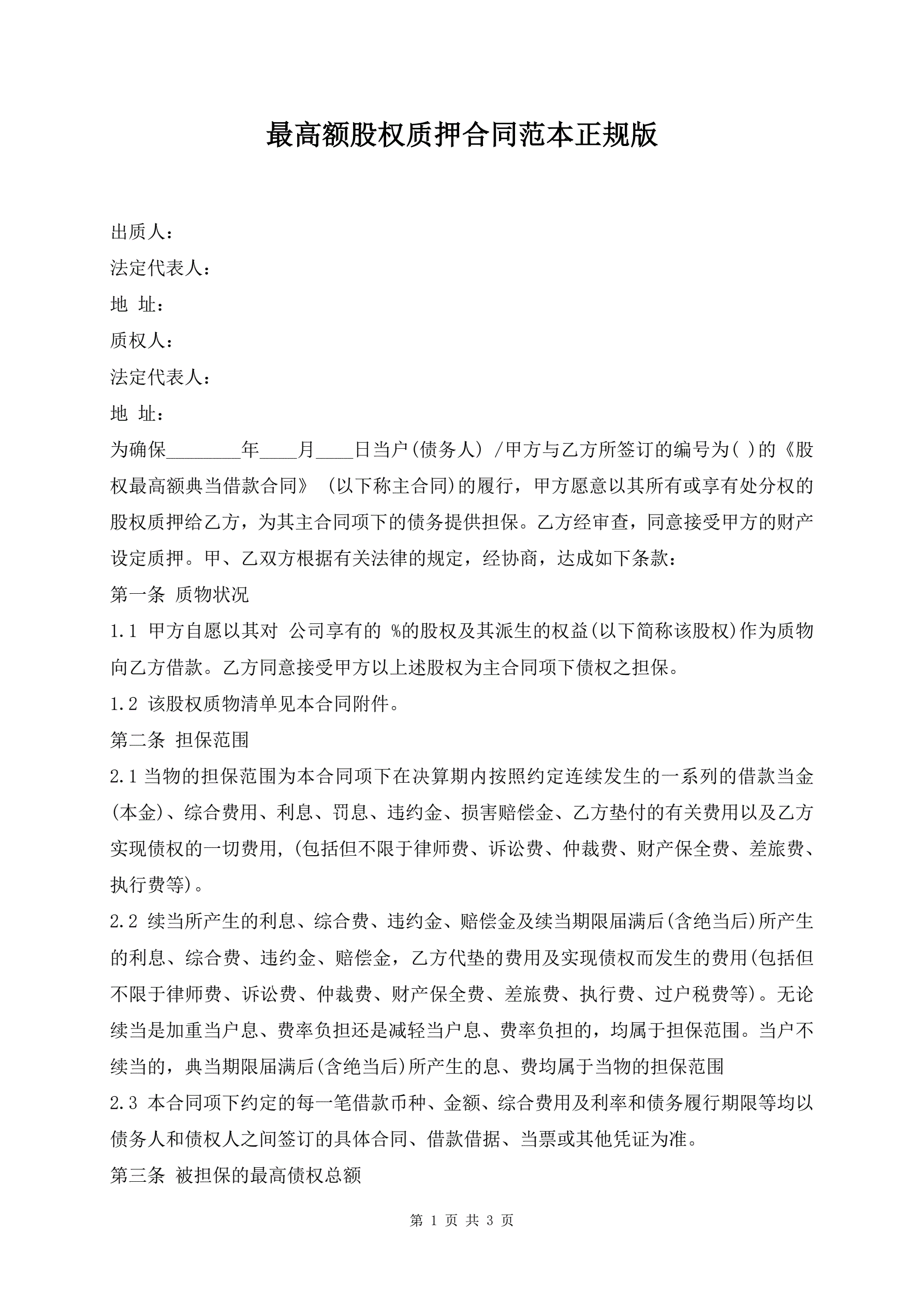 >最高额股权质押合同范本正规版