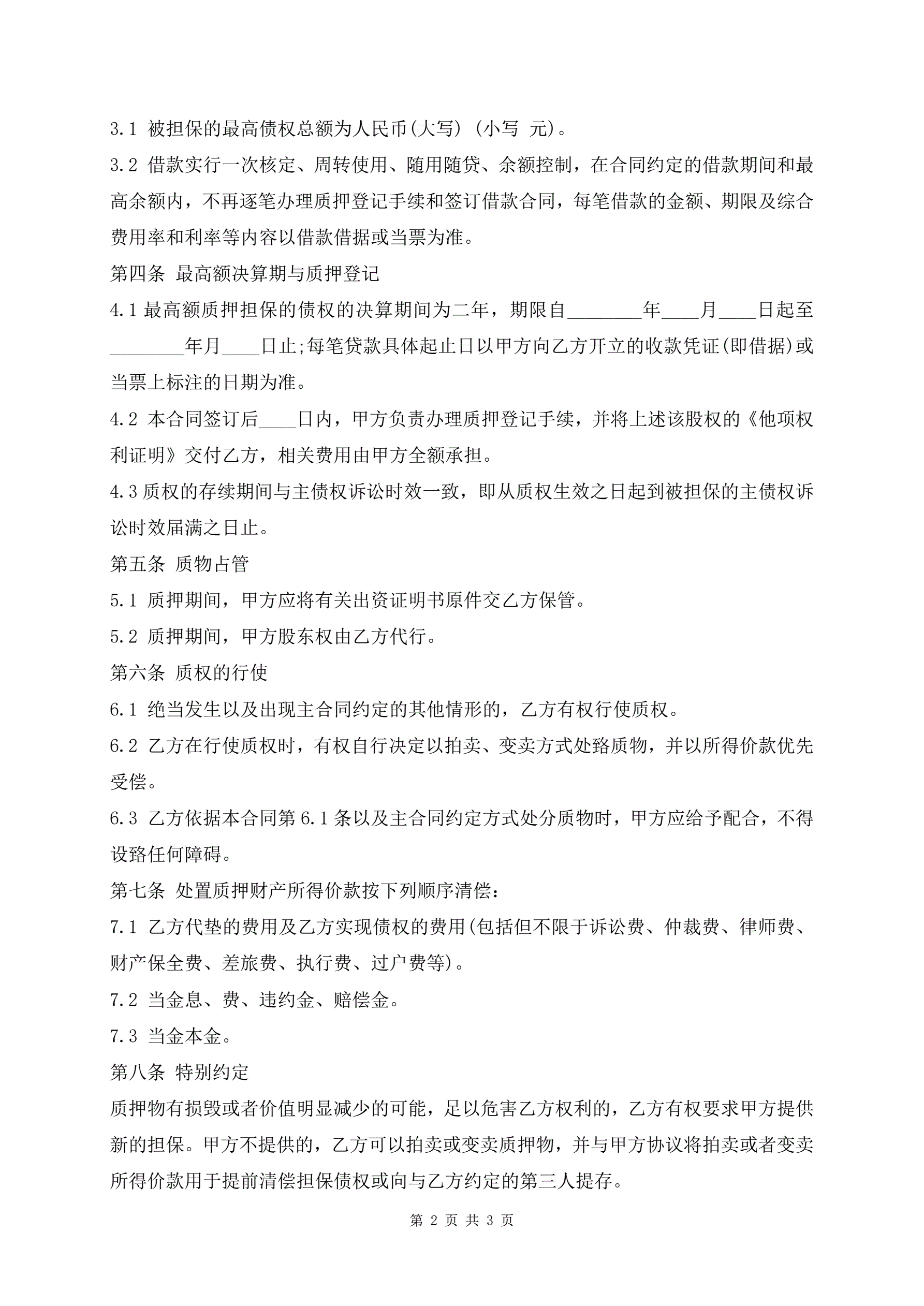 最高额股权质押合同范本正规版