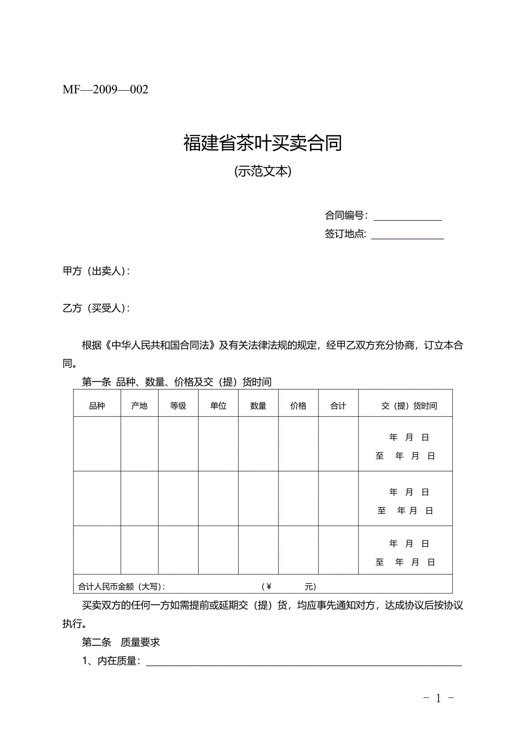 >福建省茶叶买卖合同(MF—2009—002)