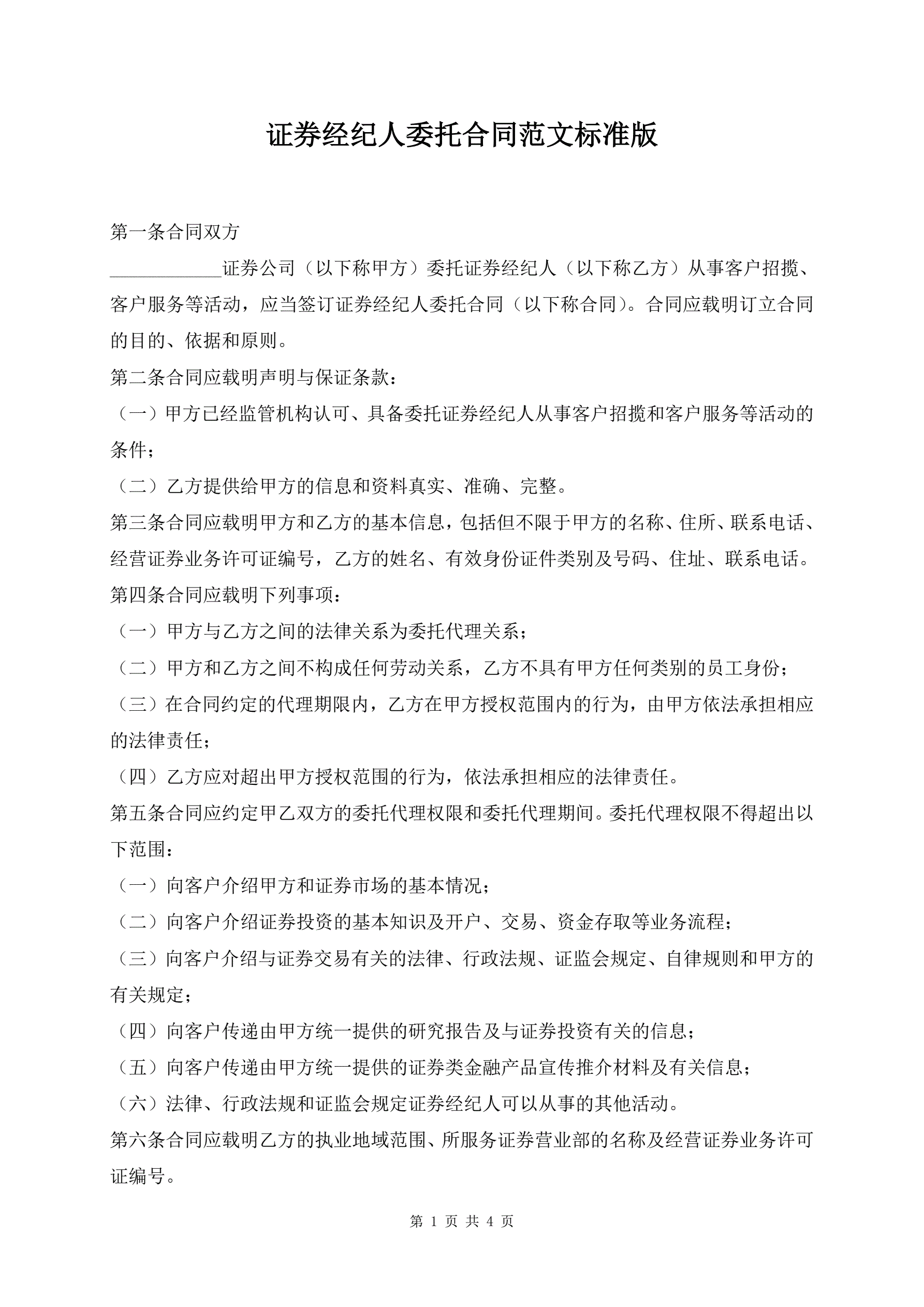 >证券经纪人委托合同范文标准版