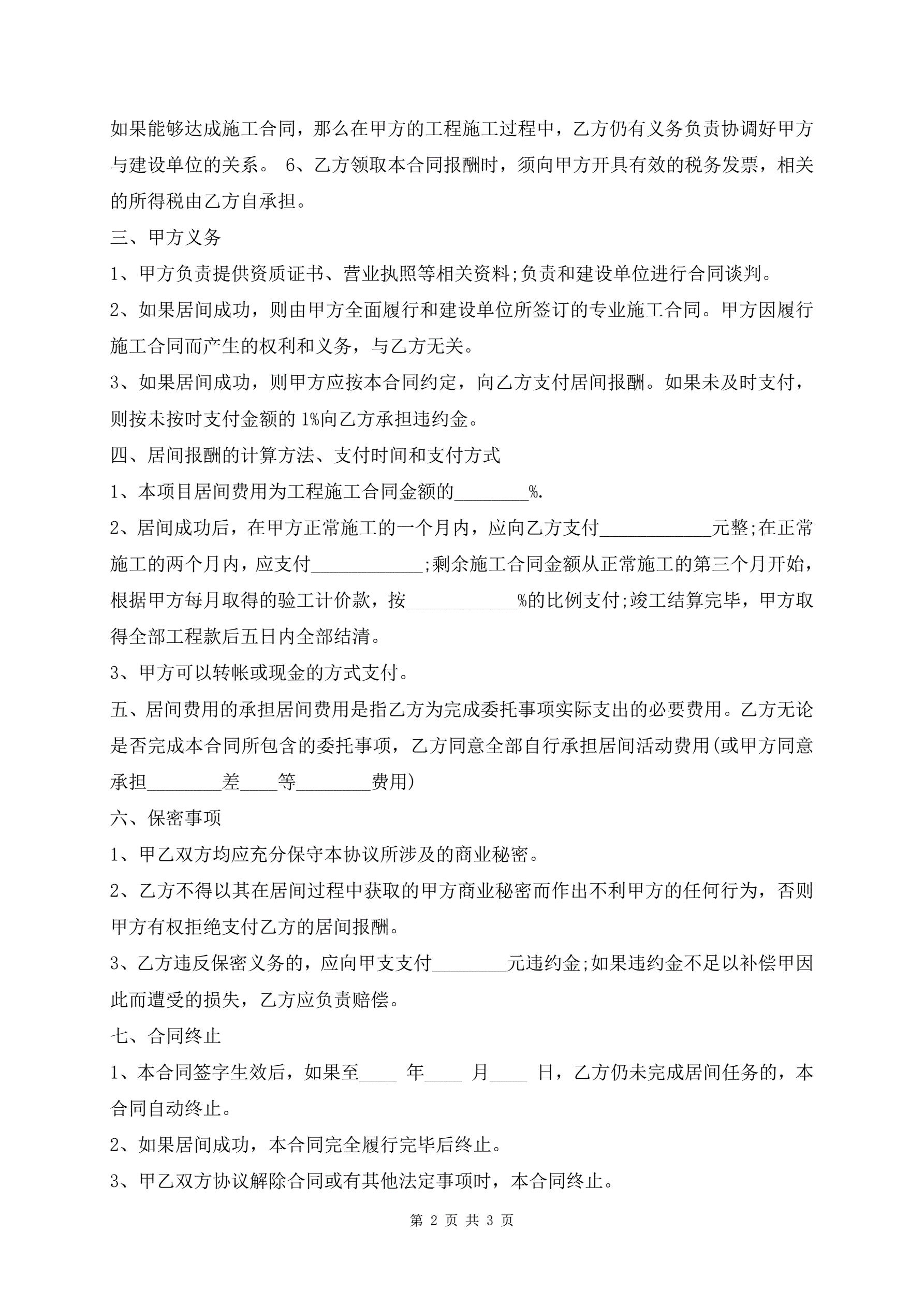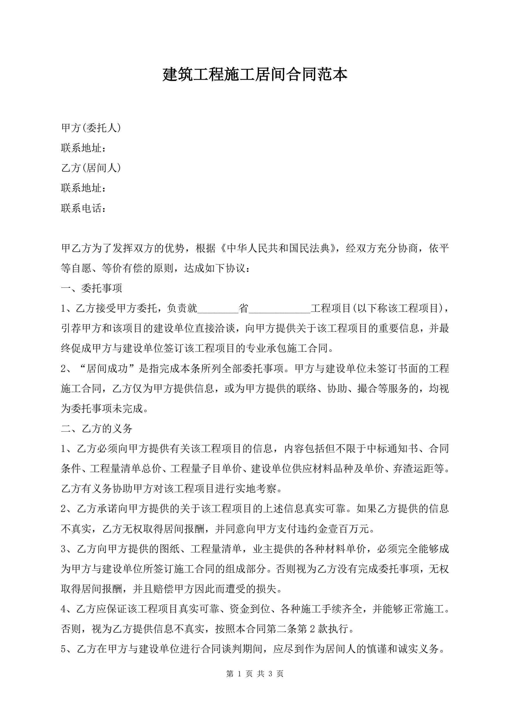 建筑工程施工居间合同范本