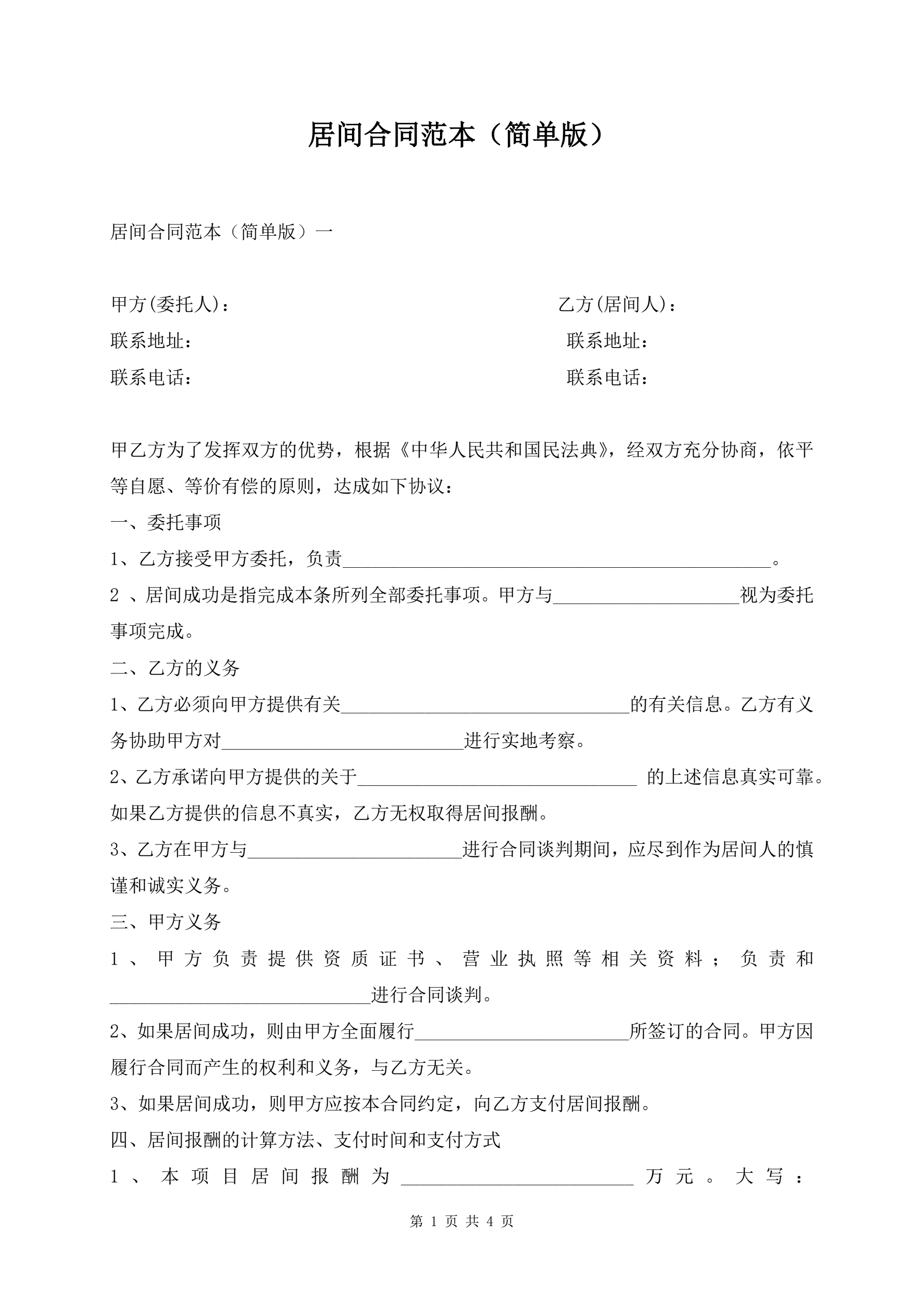 居间合同范本(简单版)