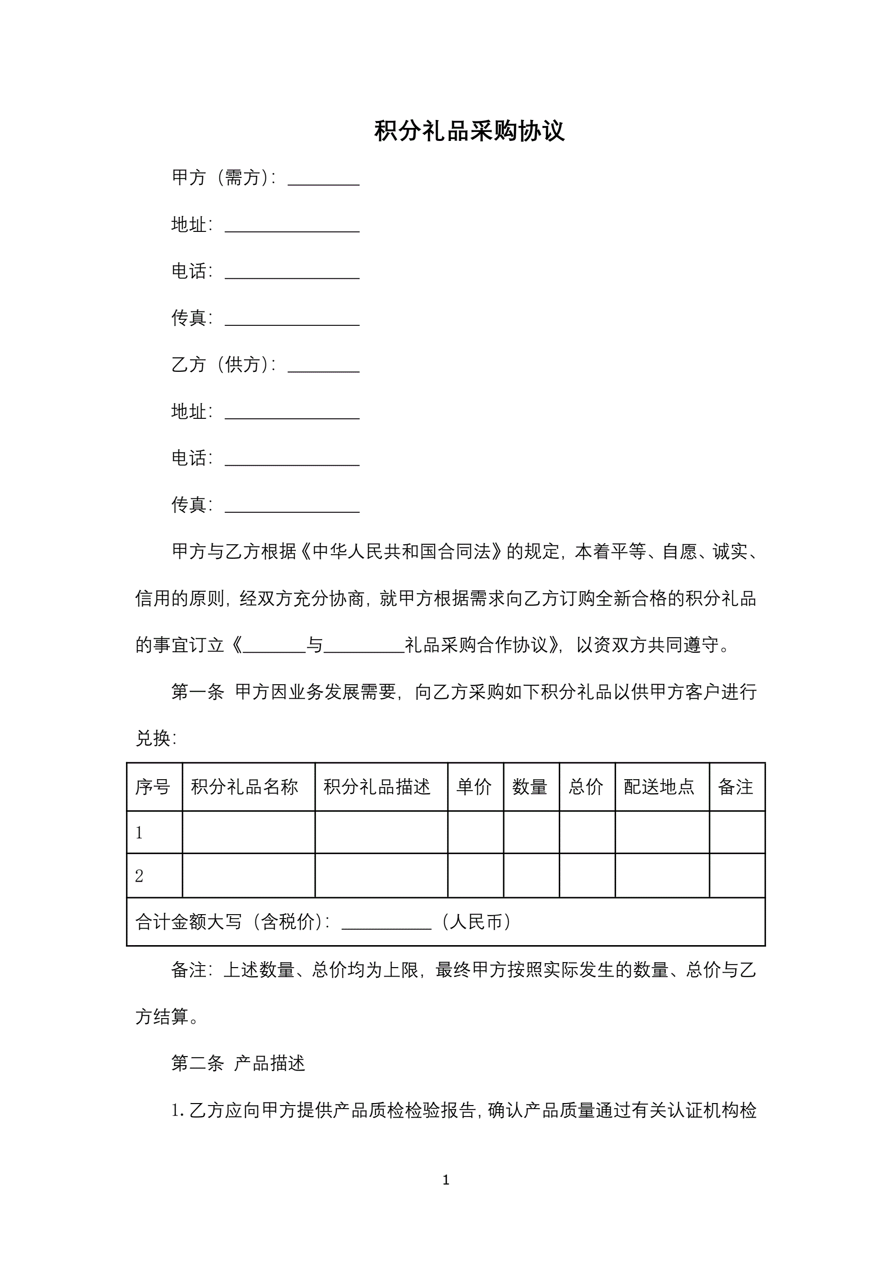 >积分礼品采购协议
