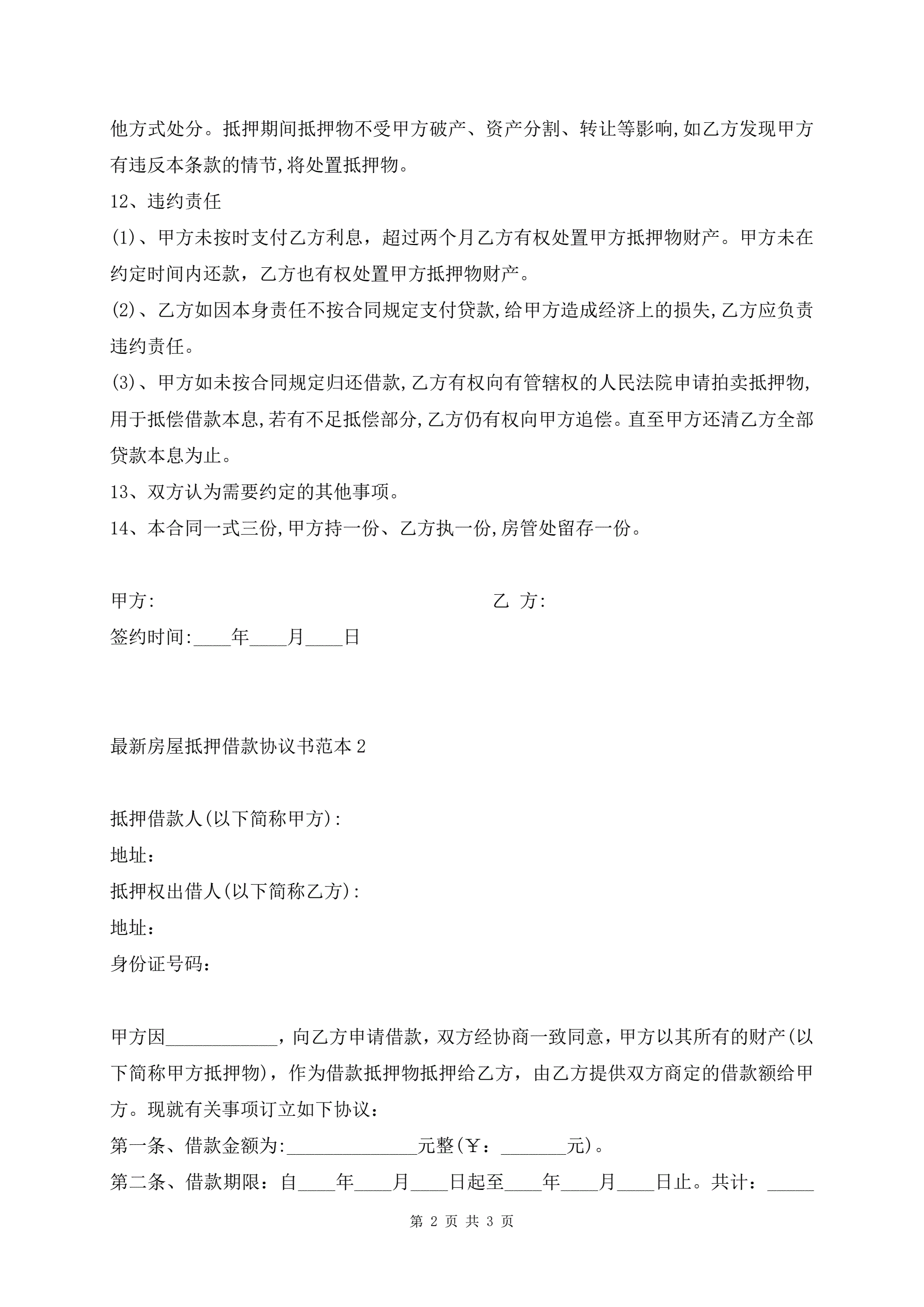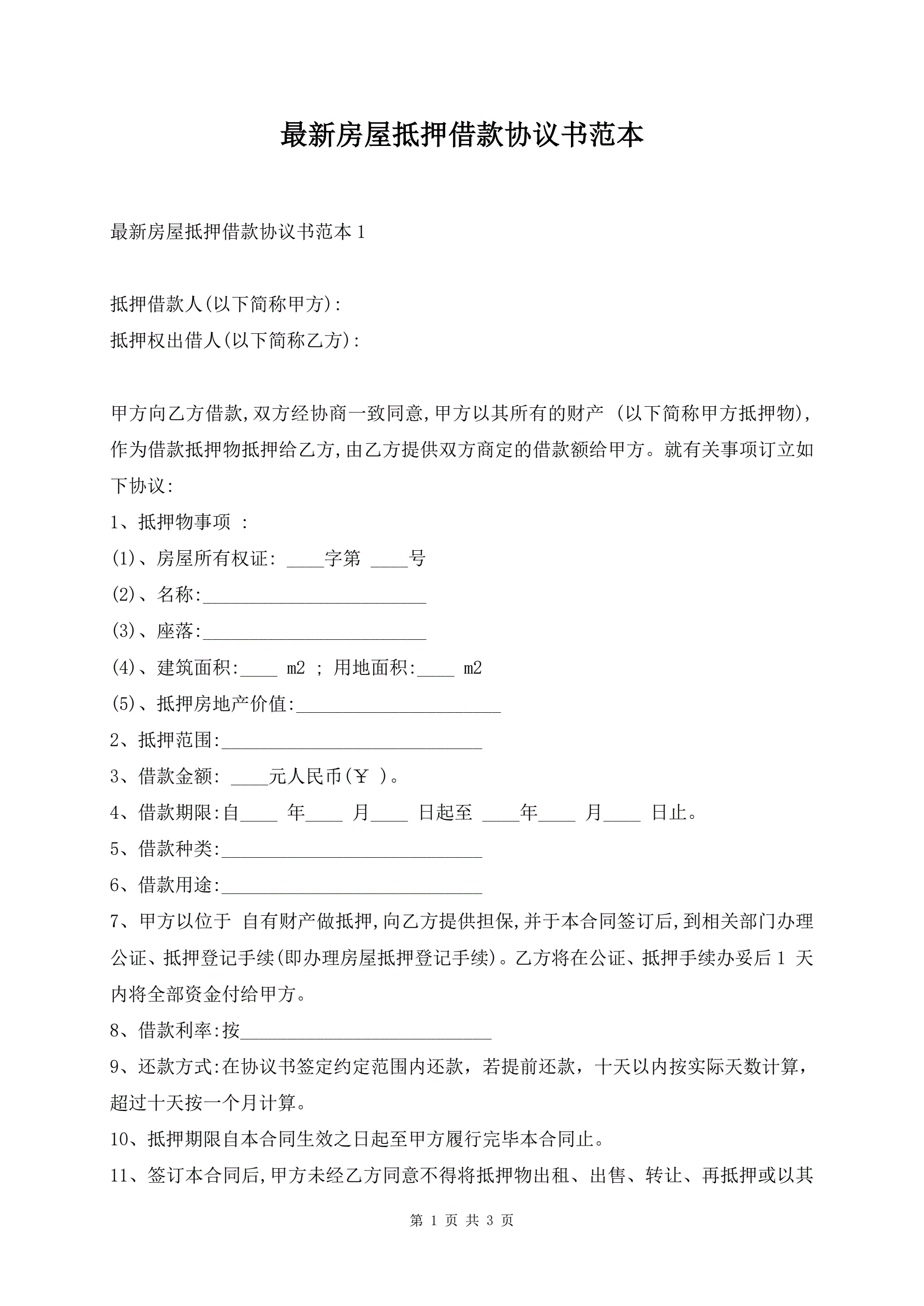 最新房屋抵押借款协议书范本