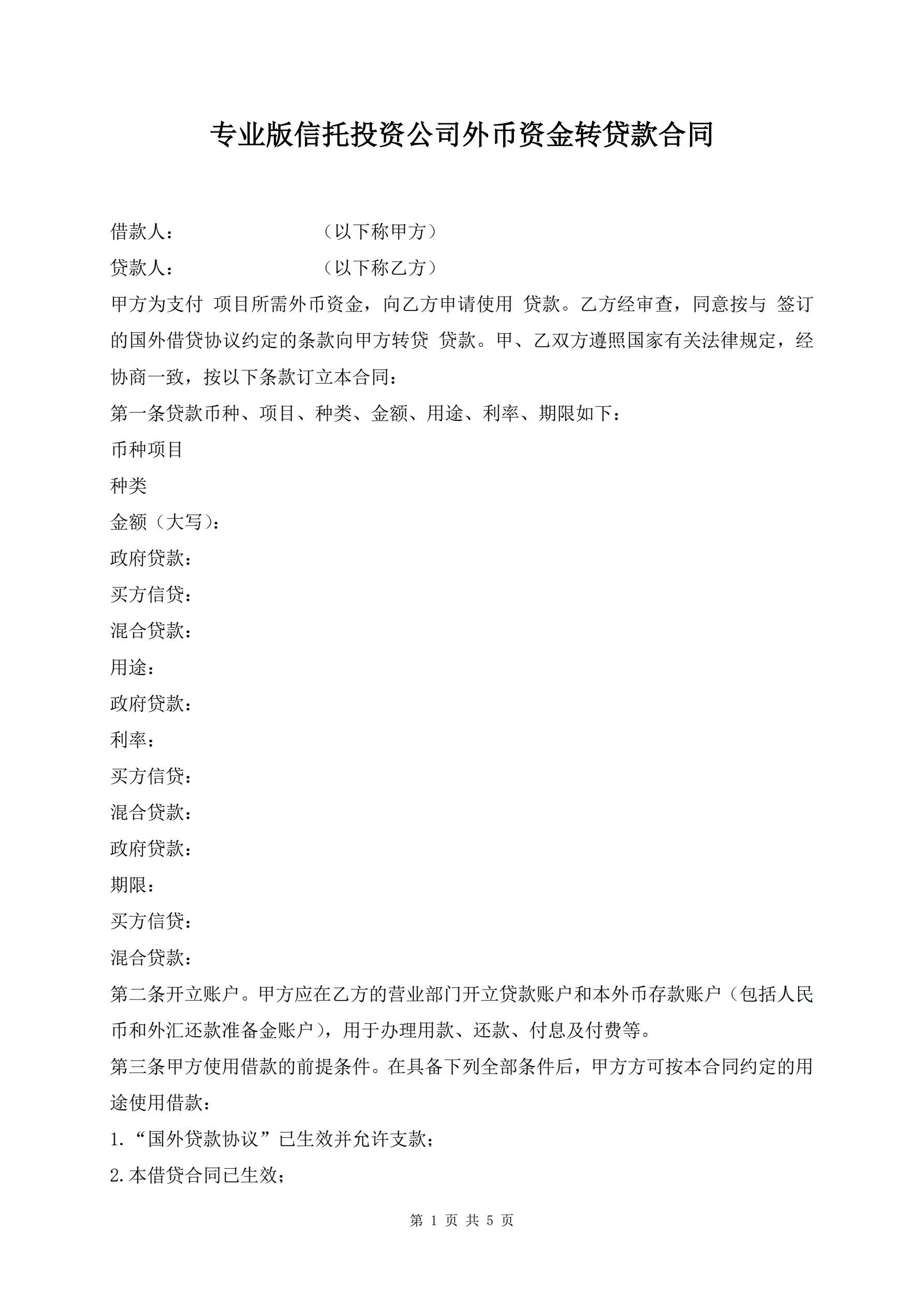 >专业版信托投资公司外币资金转贷款合同