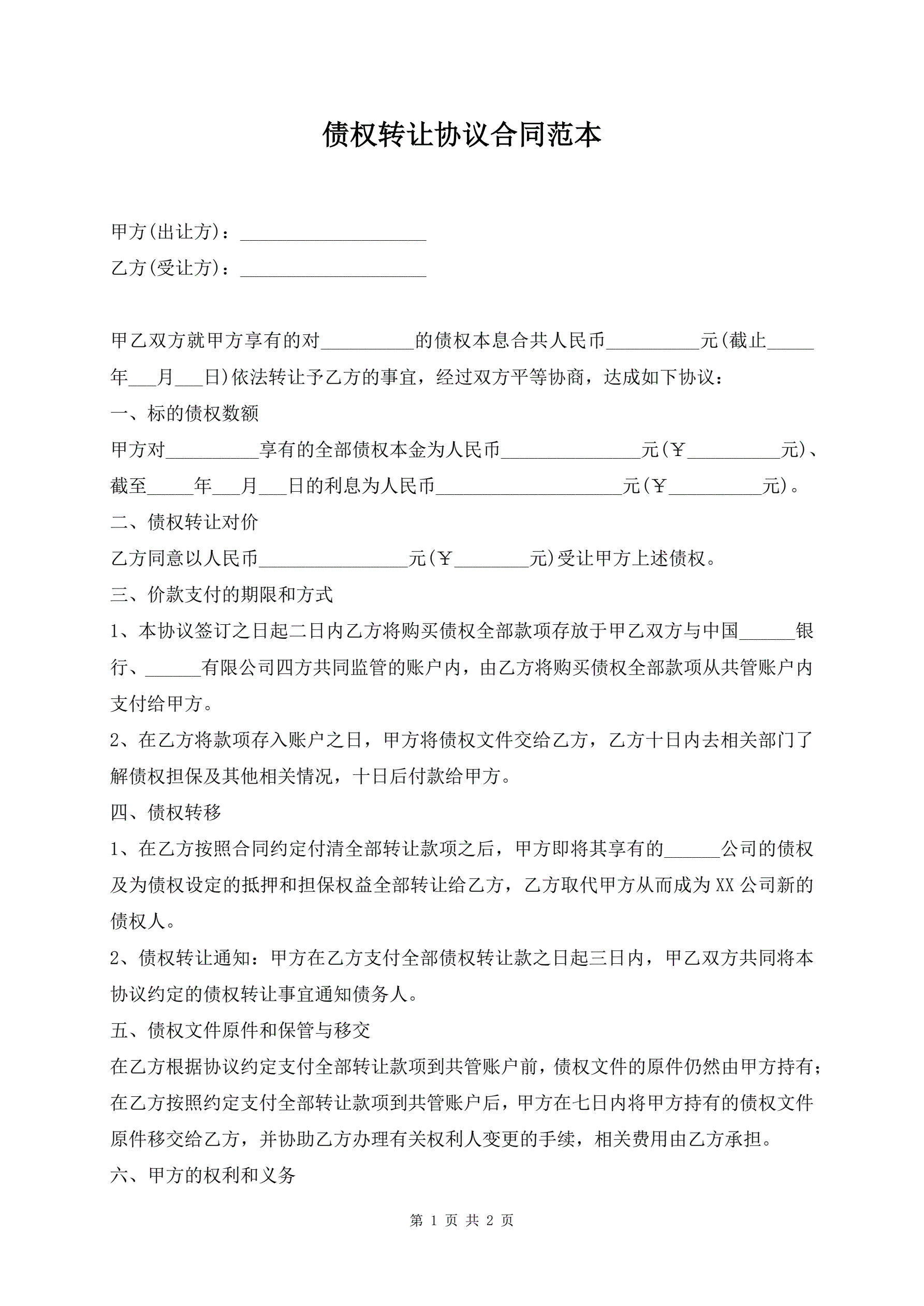 债权转让协议合同范本