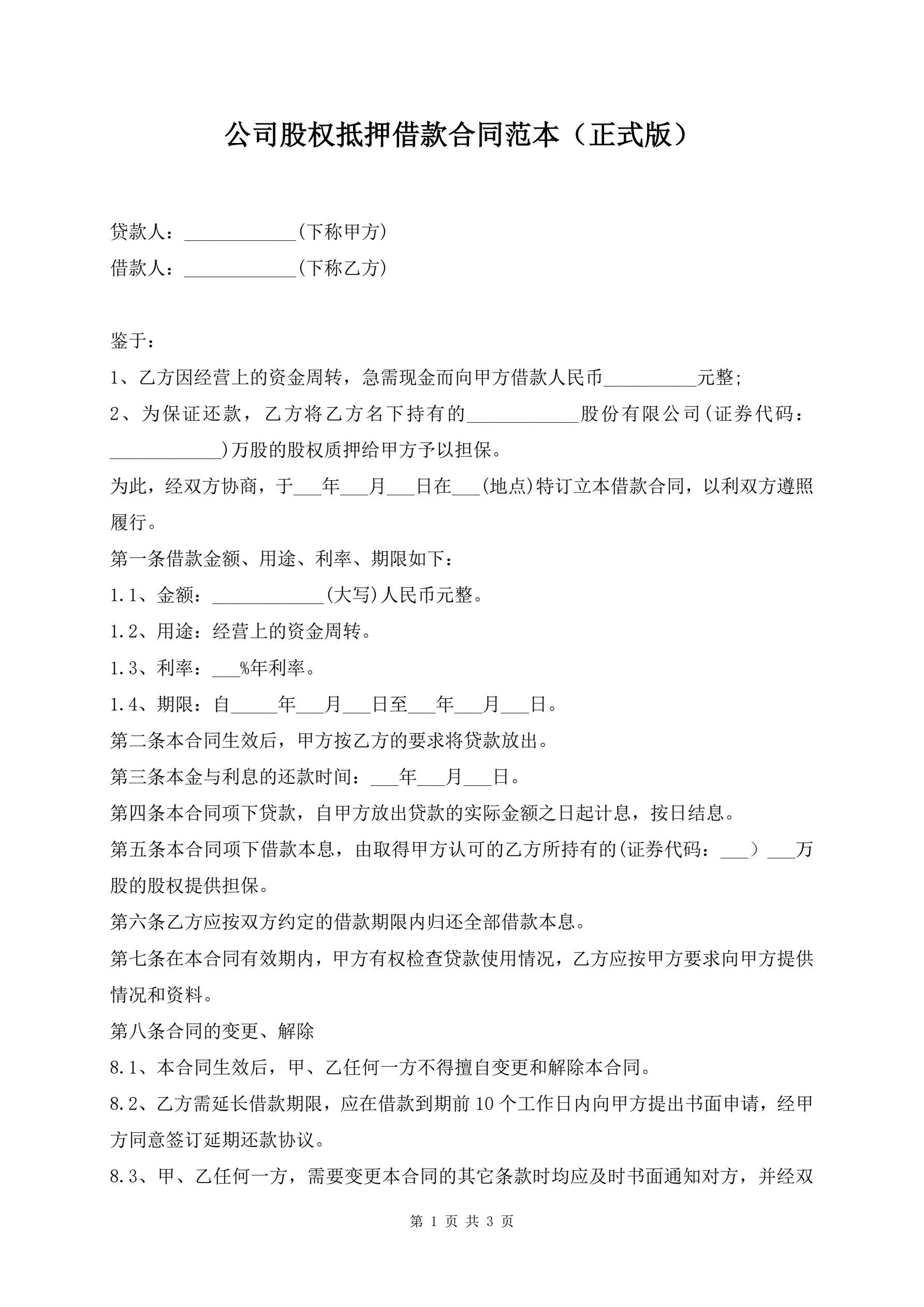 公司股权抵押借款合同范本(正式版)