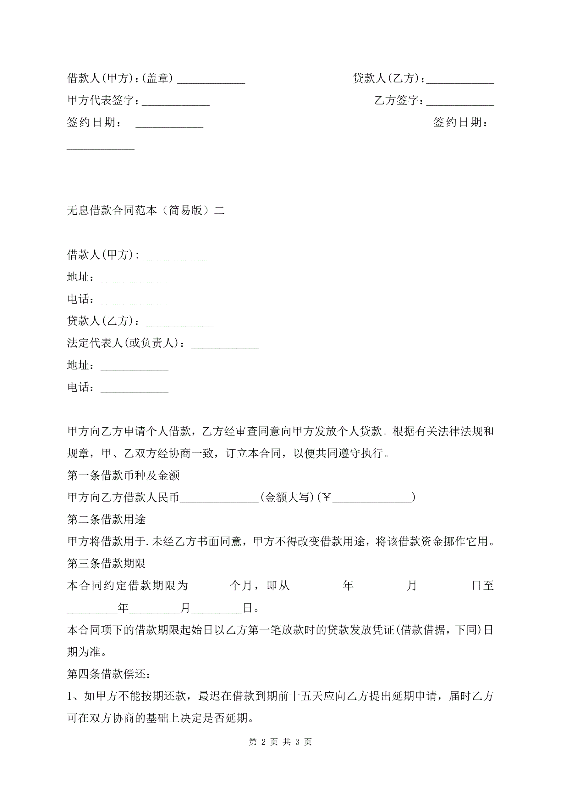 无息借款合同范本(简易版)