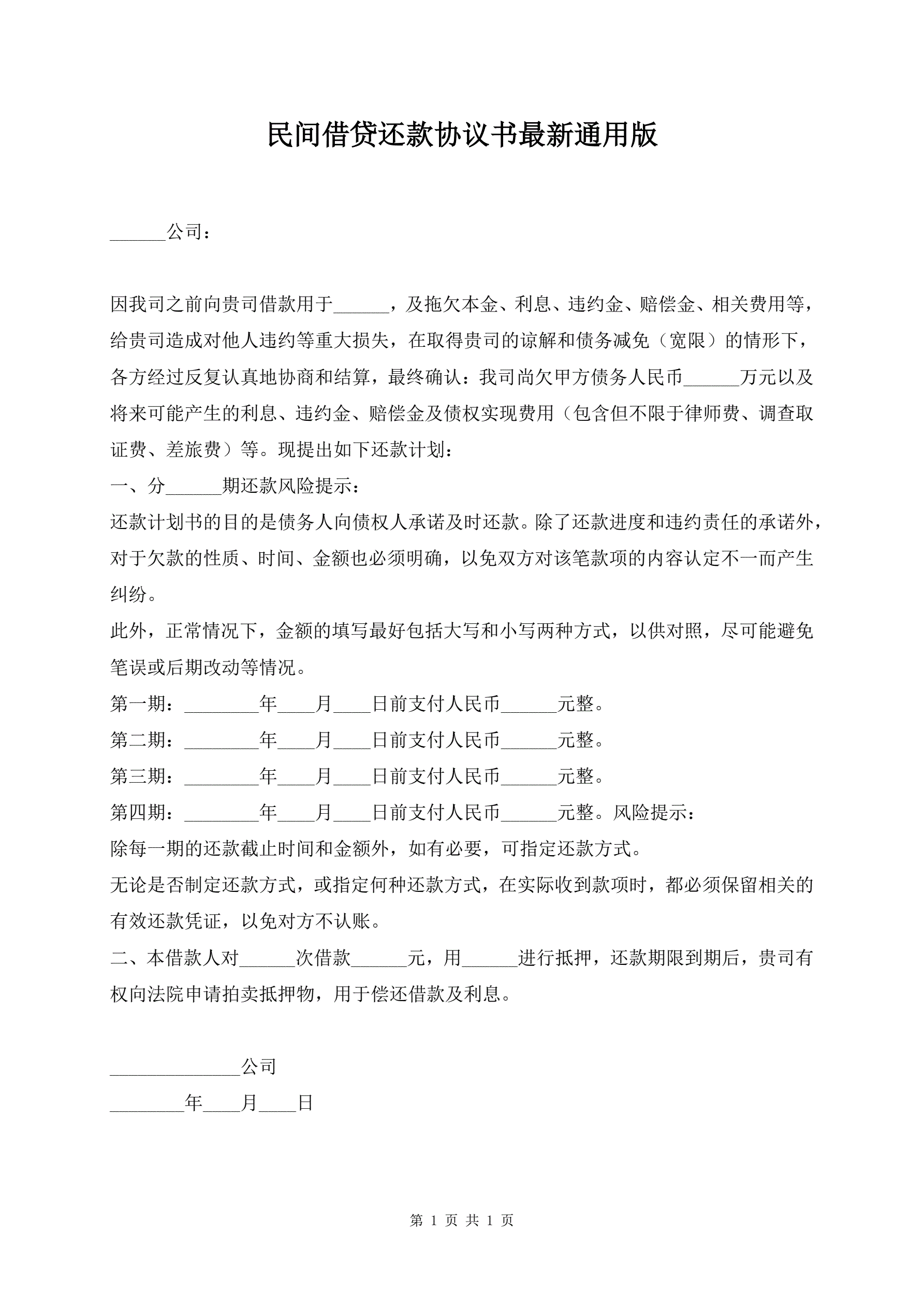 >民间借贷还款协议书最新通用版