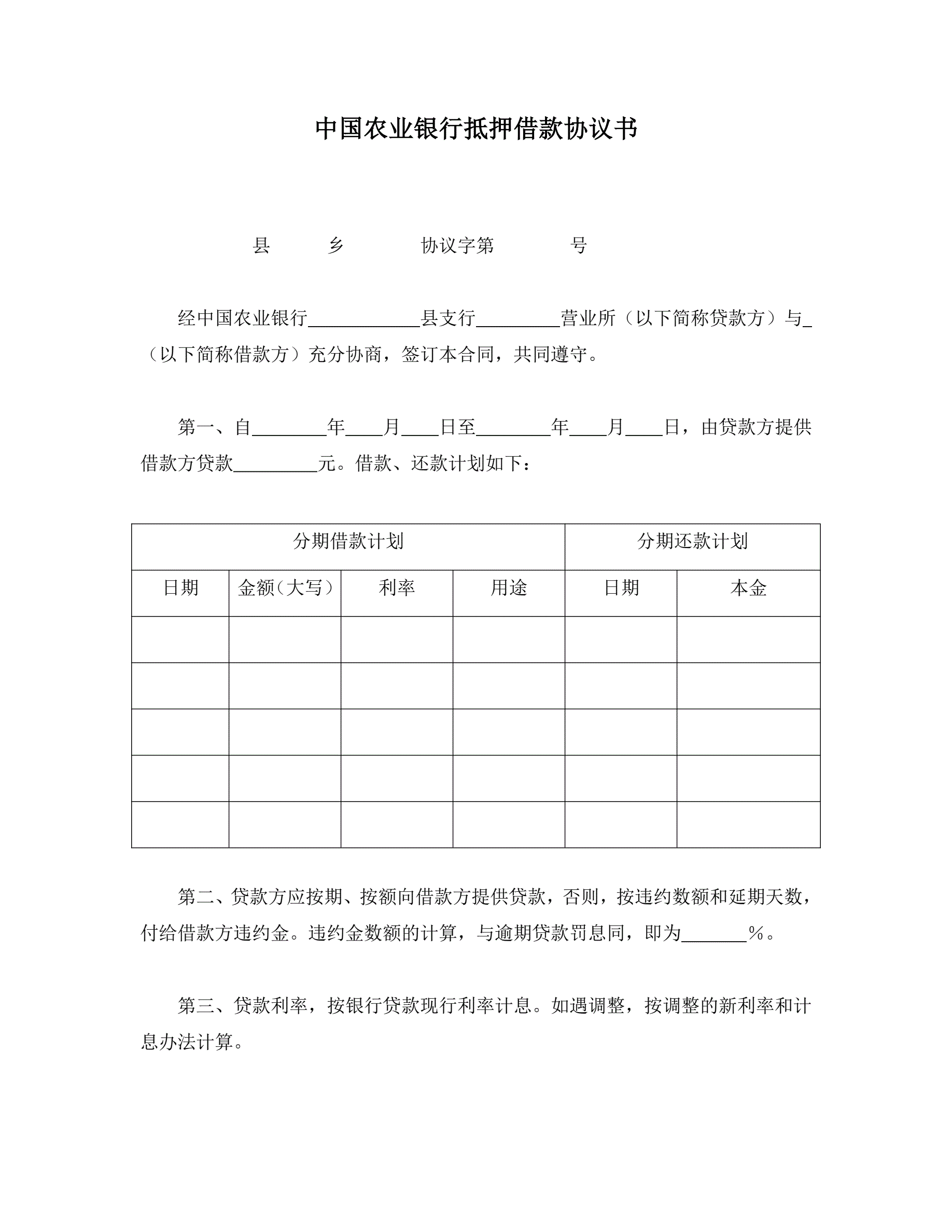合同名称:中国农业银行抵押借款协议书
