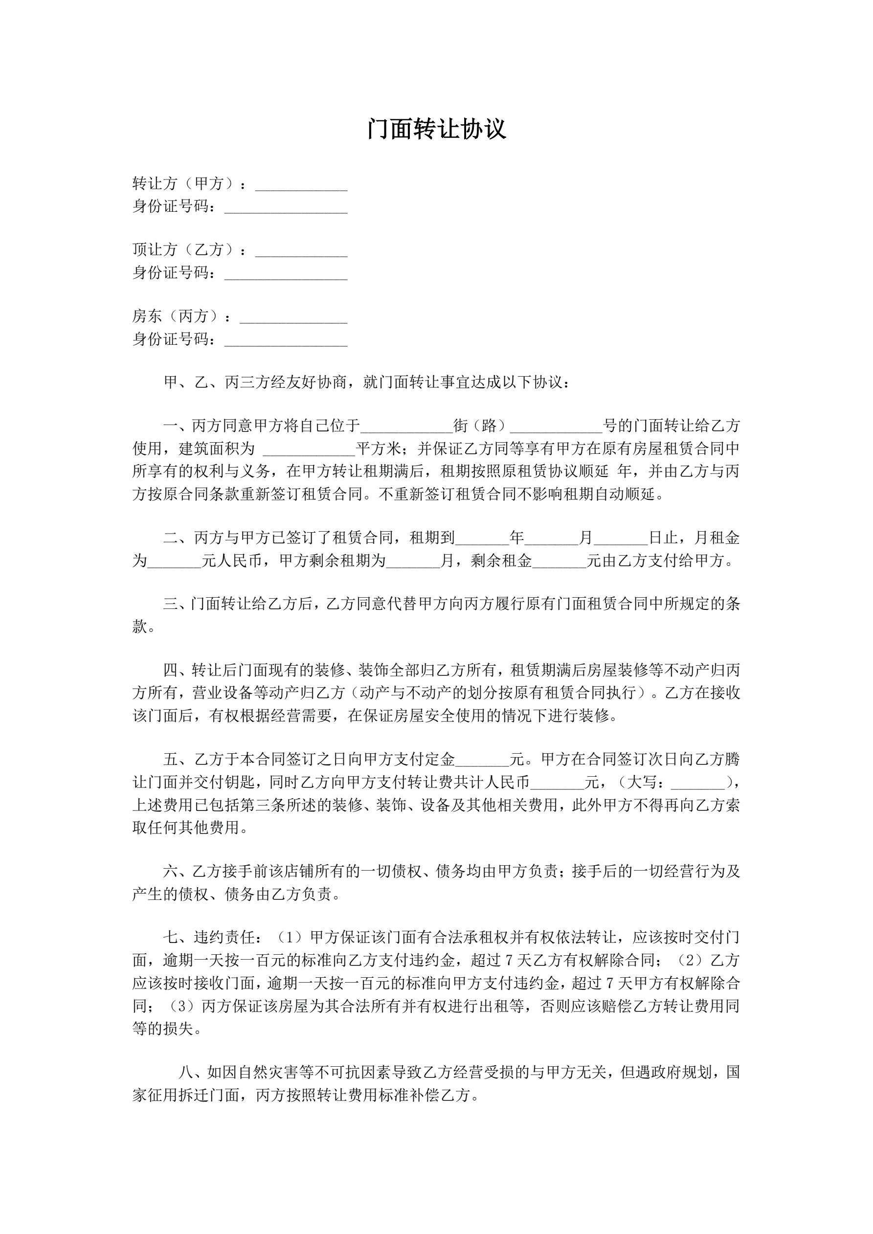 门面转让协议