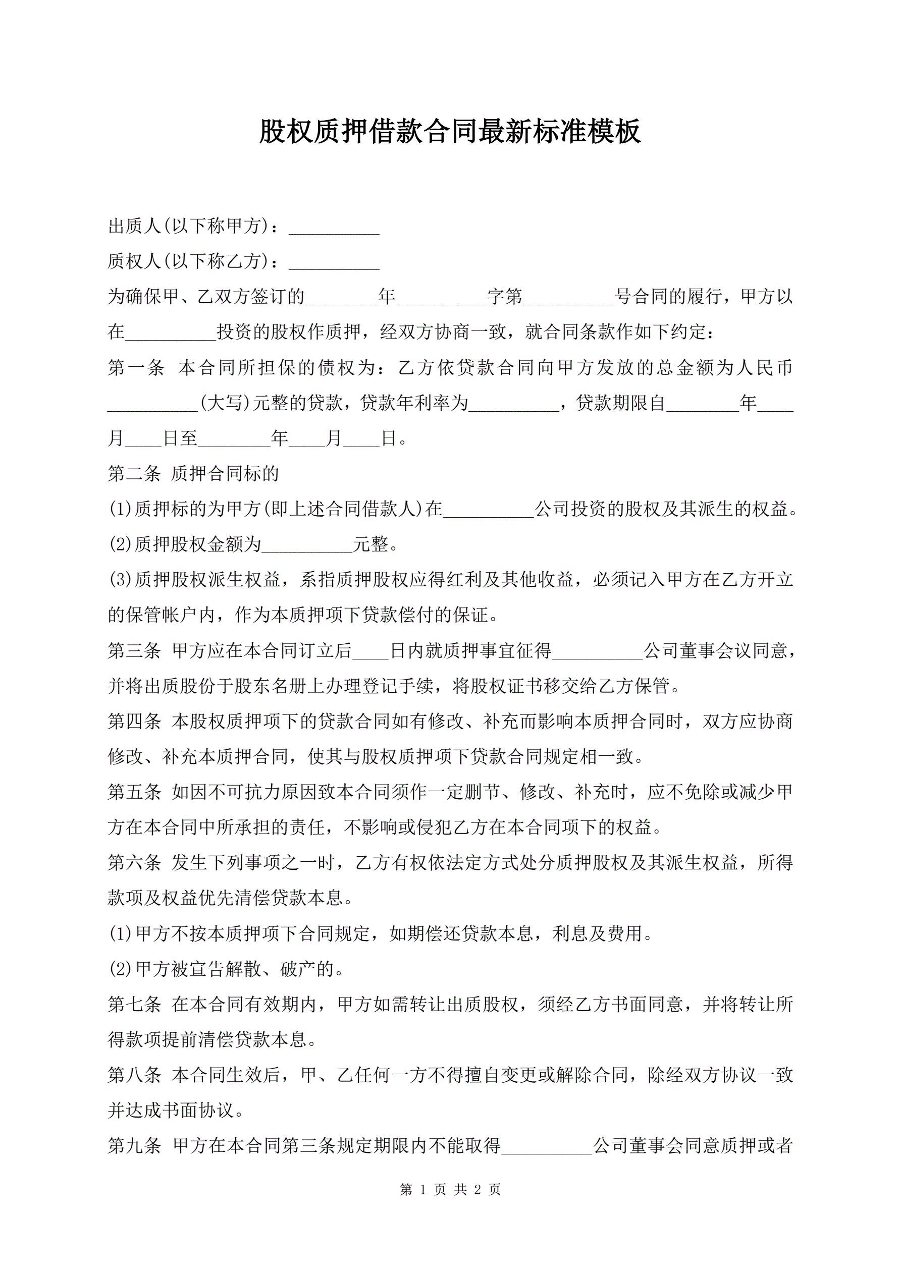 股权质押借款合同最新标准模板