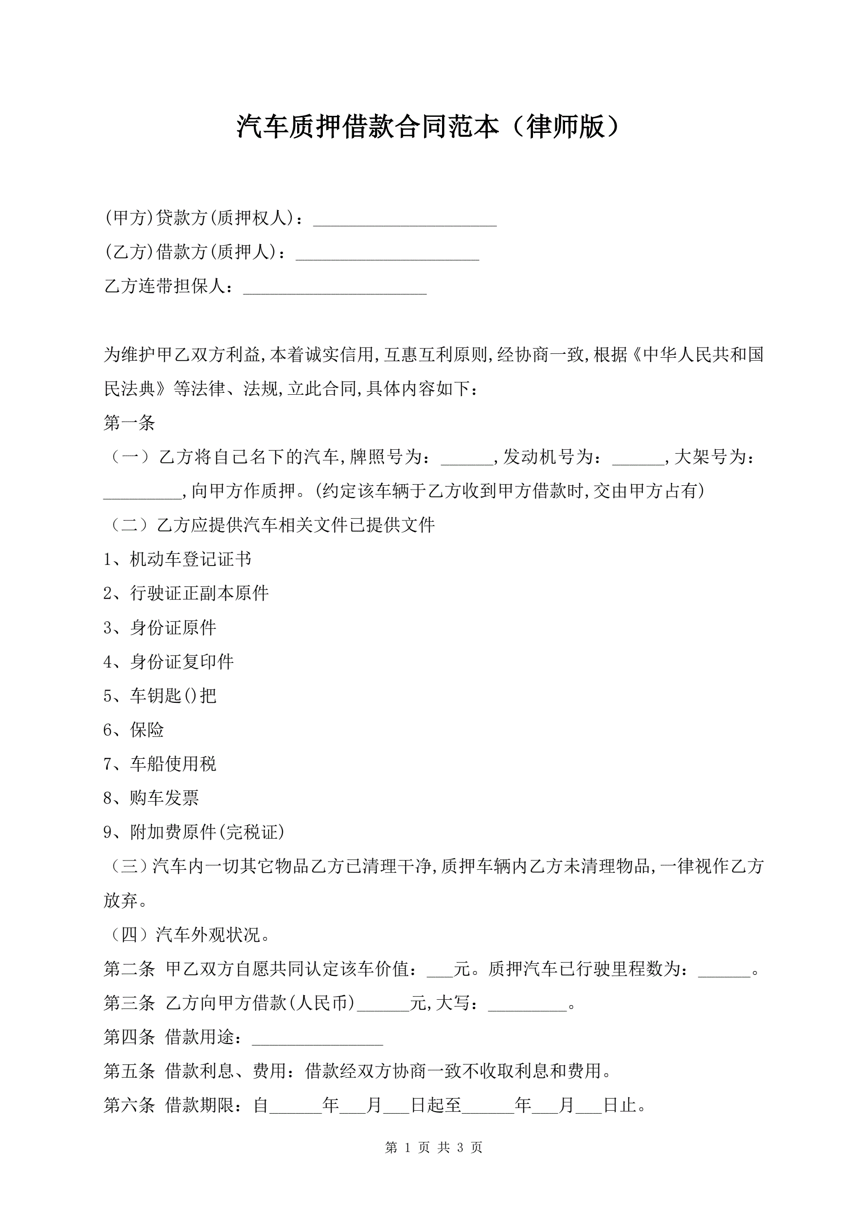 >汽车质押借款合同范本(律师版)