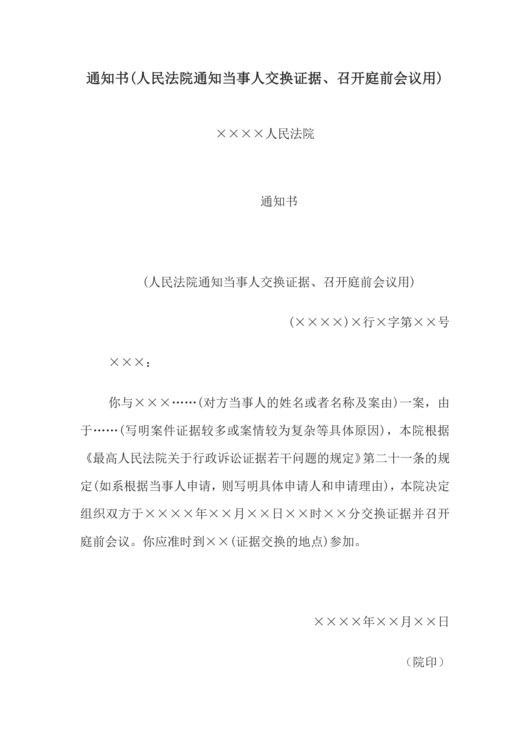 通知书(人民法院通知当事人交换证据、召开庭前会议用)