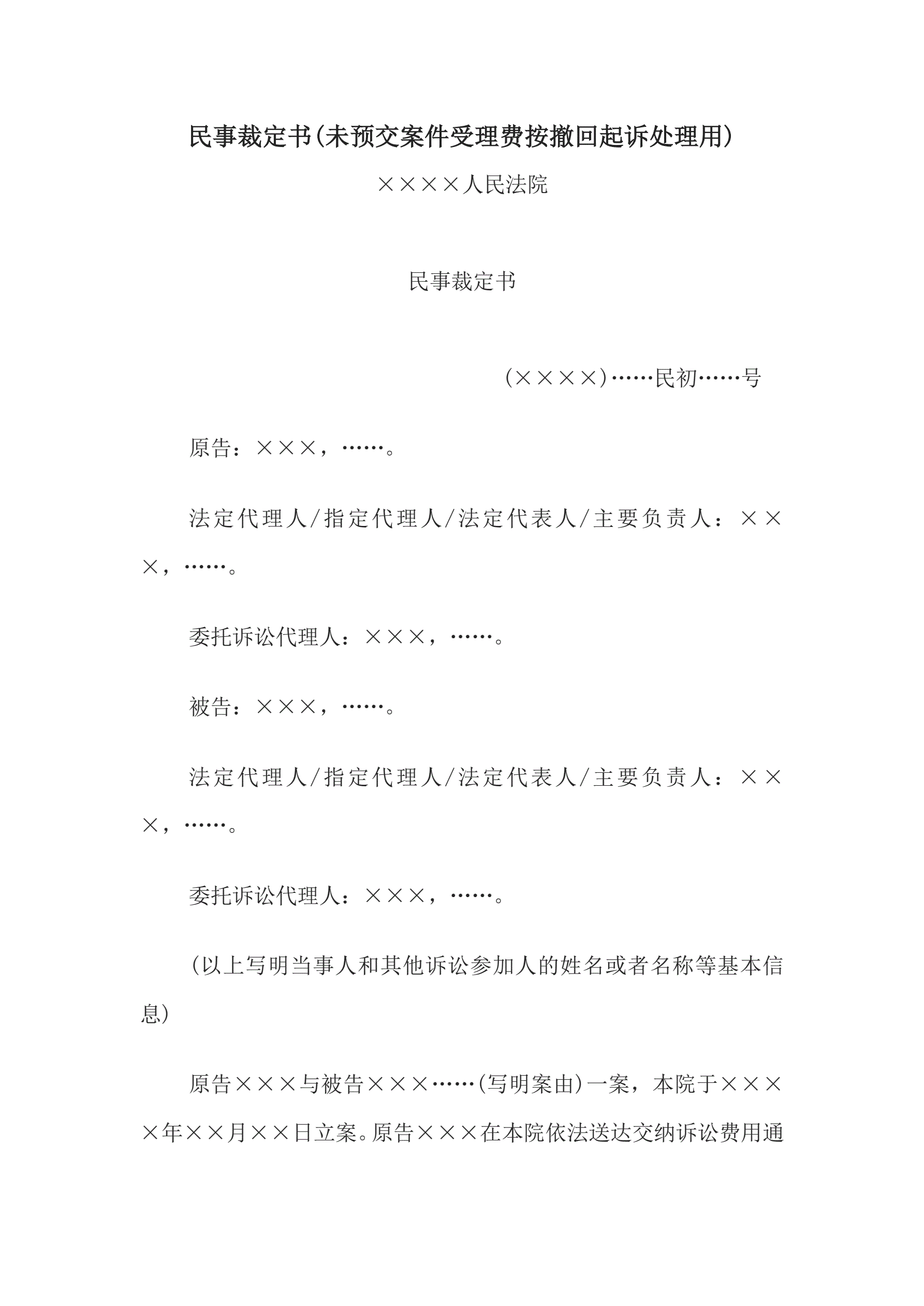 >民事裁定书(未预交案件受理费按撤回起诉处理用)