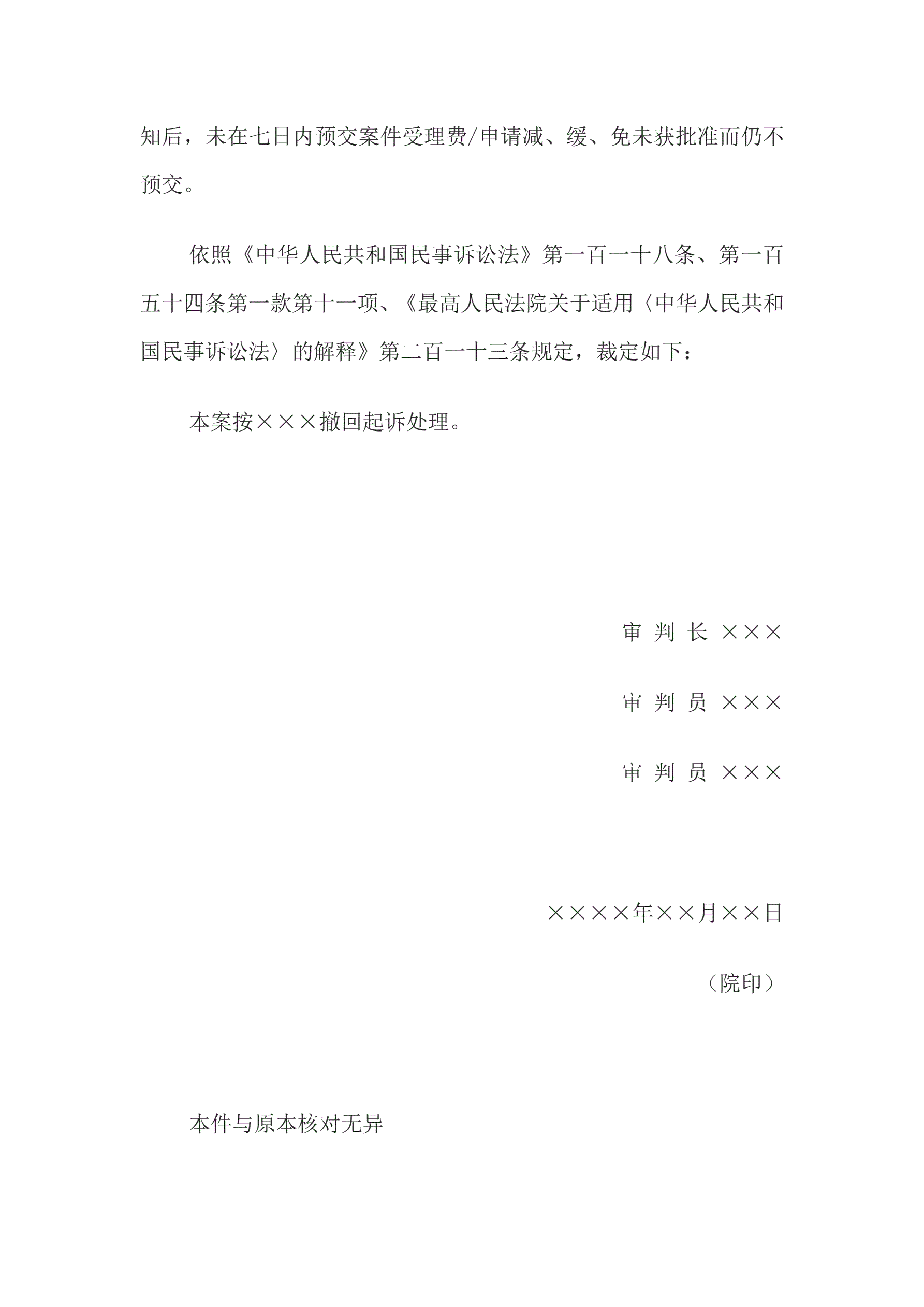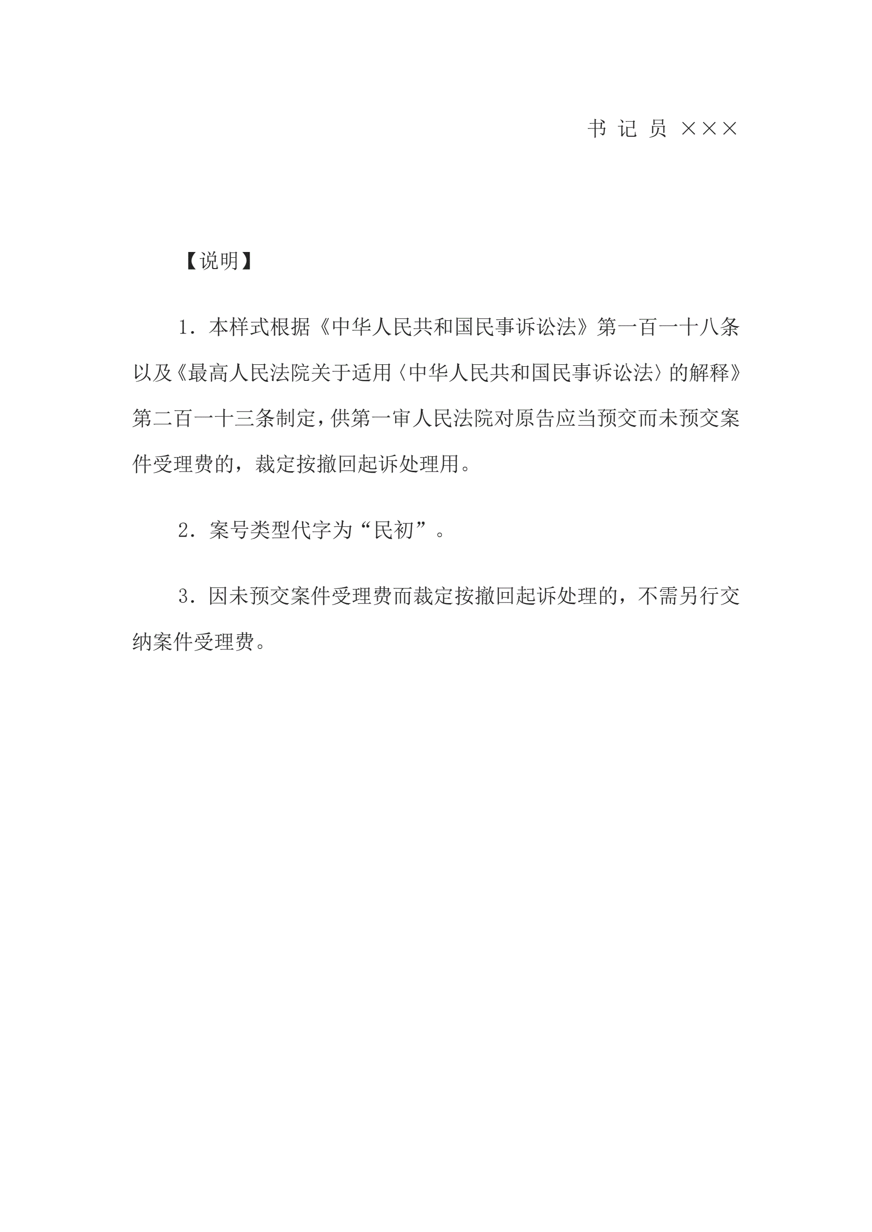 民事裁定书(未预交案件受理费按撤回起诉处理用)