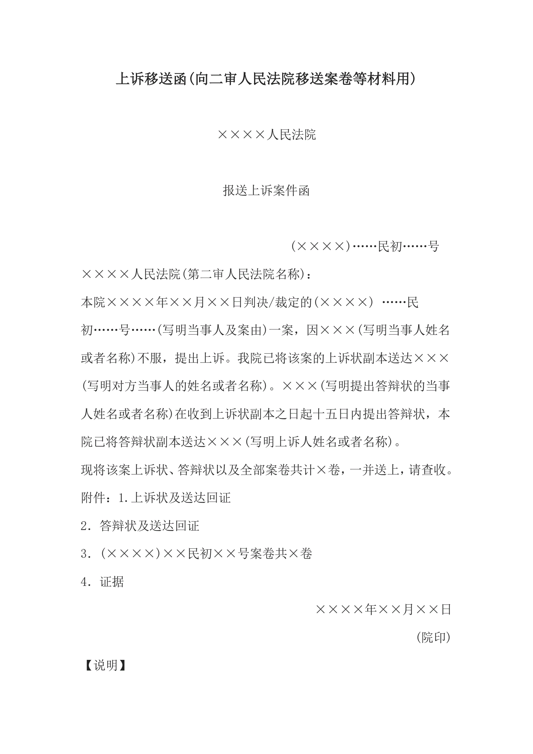 上诉移送函(向二审人民法院移送案卷等材料用)