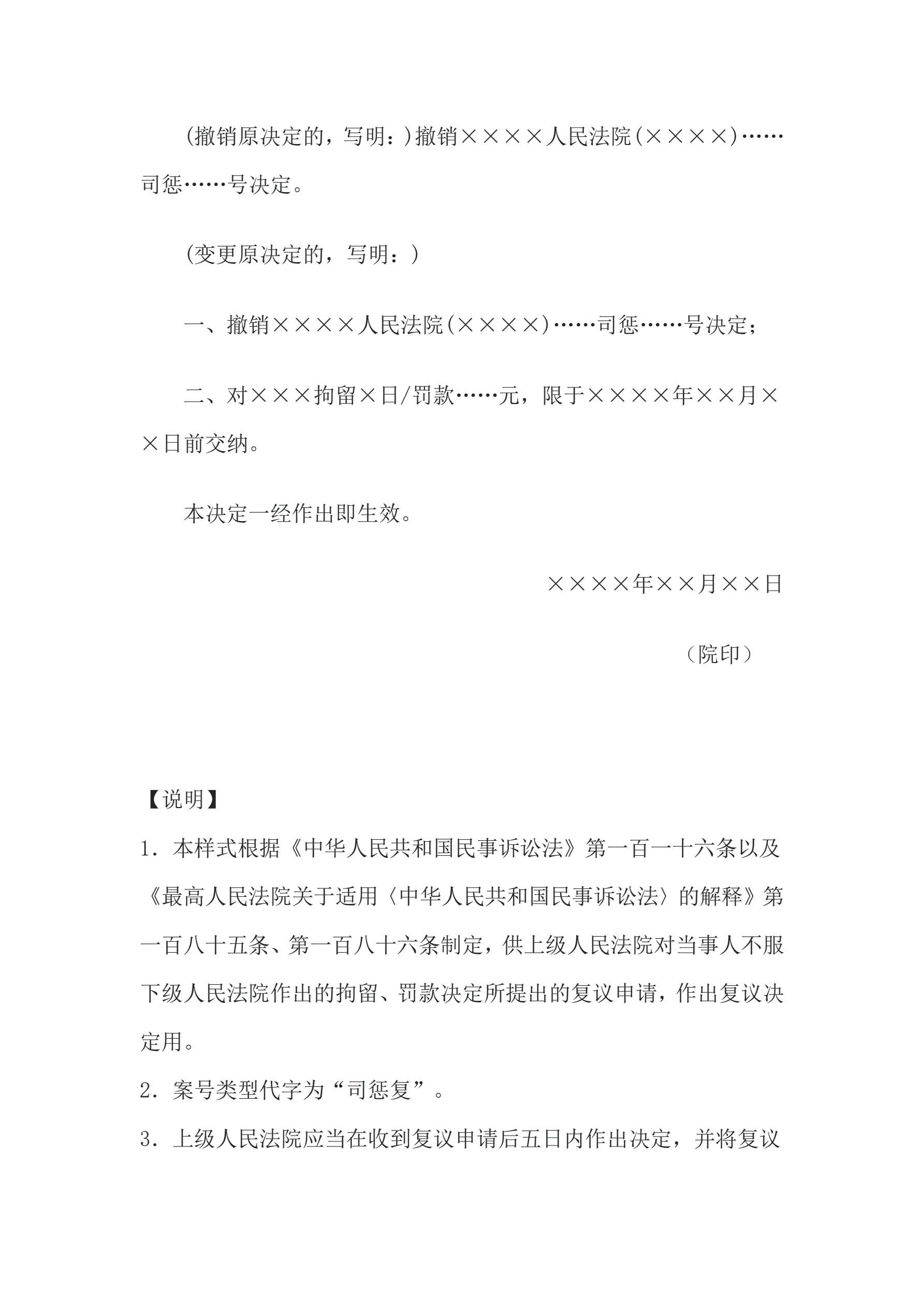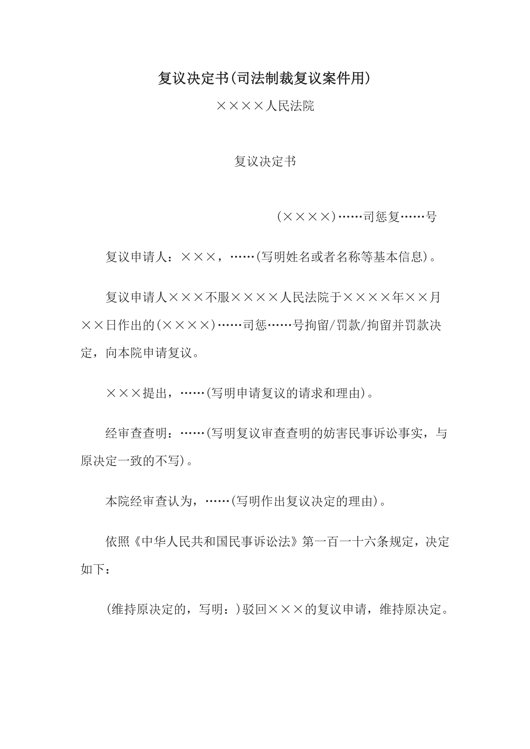 >复议决定书(司法制裁复议案件用)