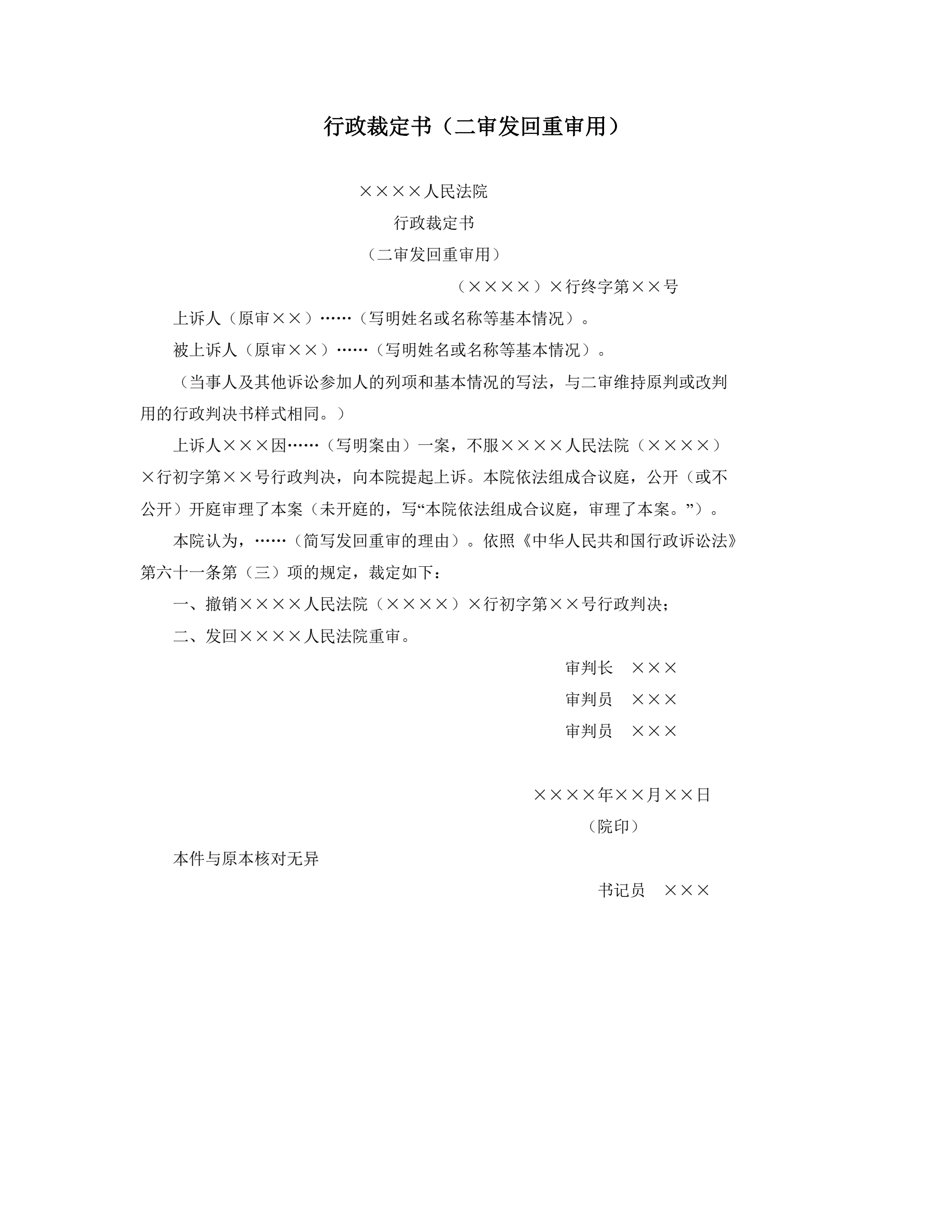 >行政裁定书(二审发回重审用)