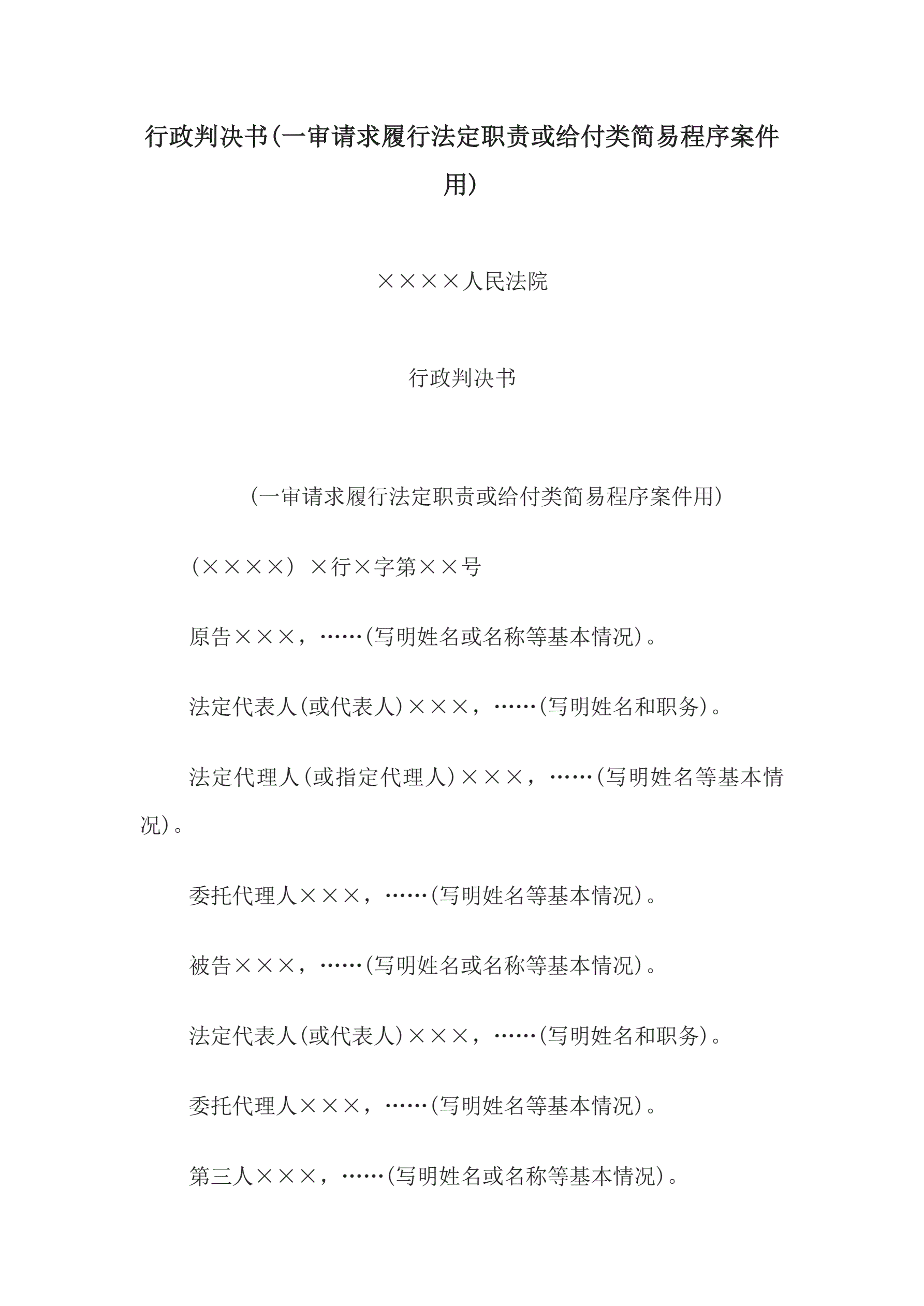 行政判决书(一审请求履行法定职责或给付类简易程序案件用)