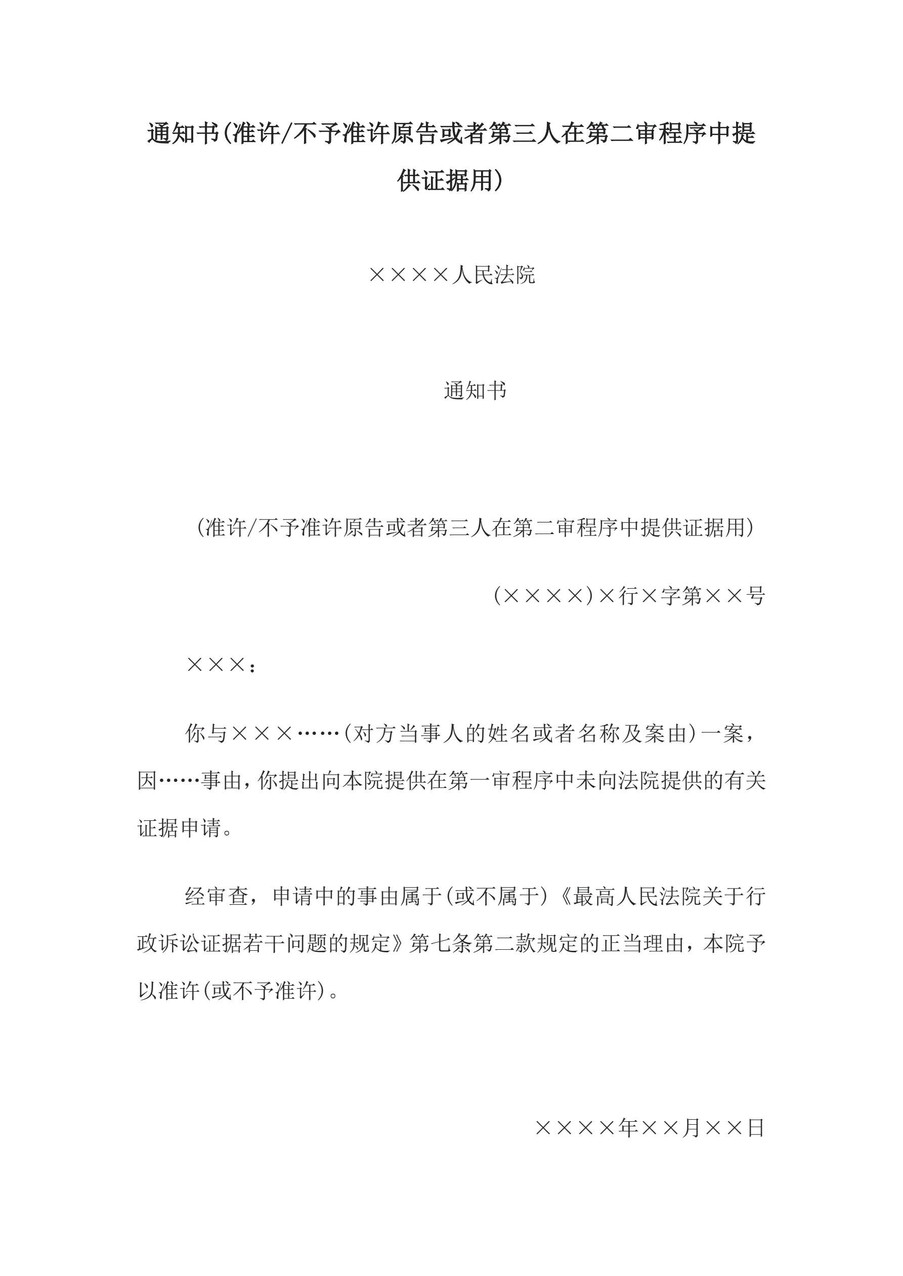 >通知书(准许或不予准许原告或者第三人在第二审程序中提供证据用)