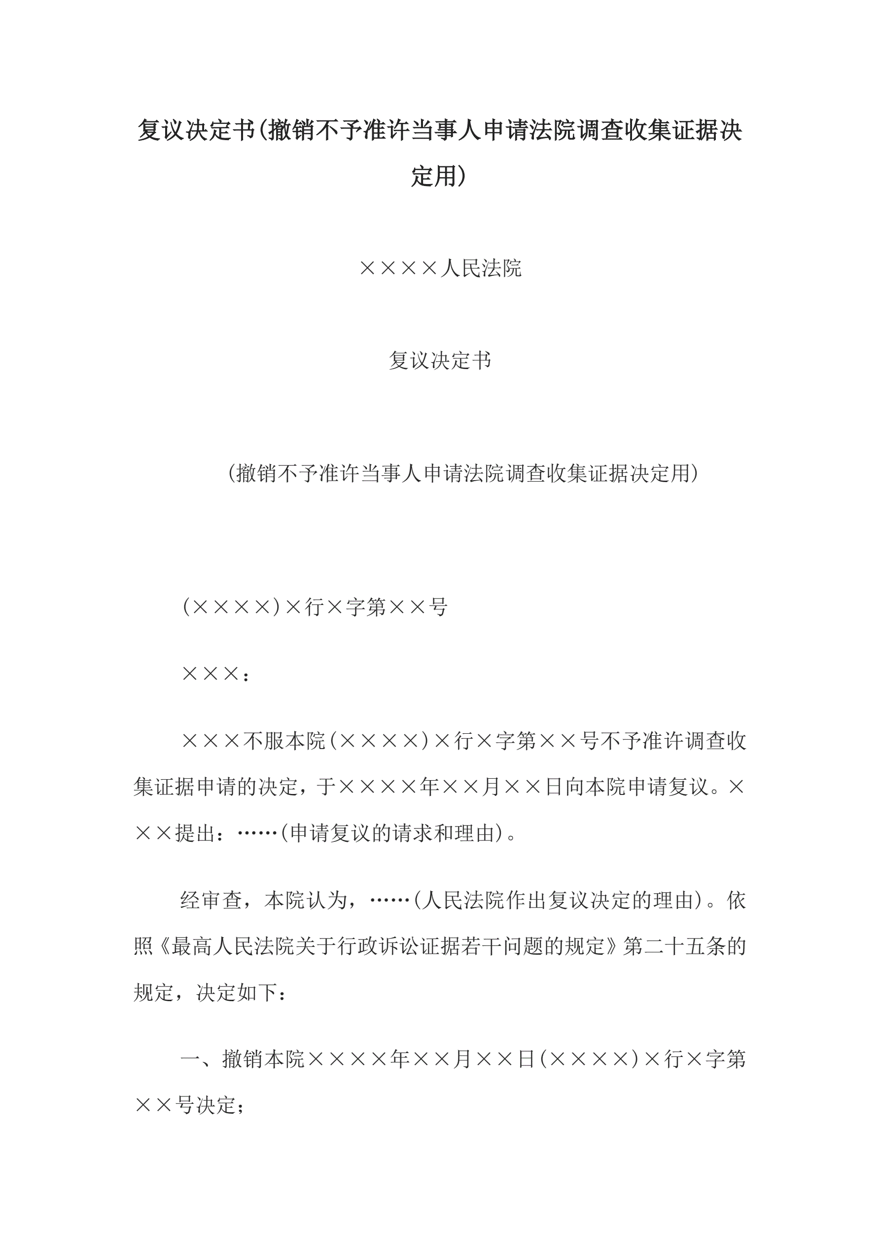 >复议决定书(撤销不予准许当事人申请法院调查收集证据决定用)