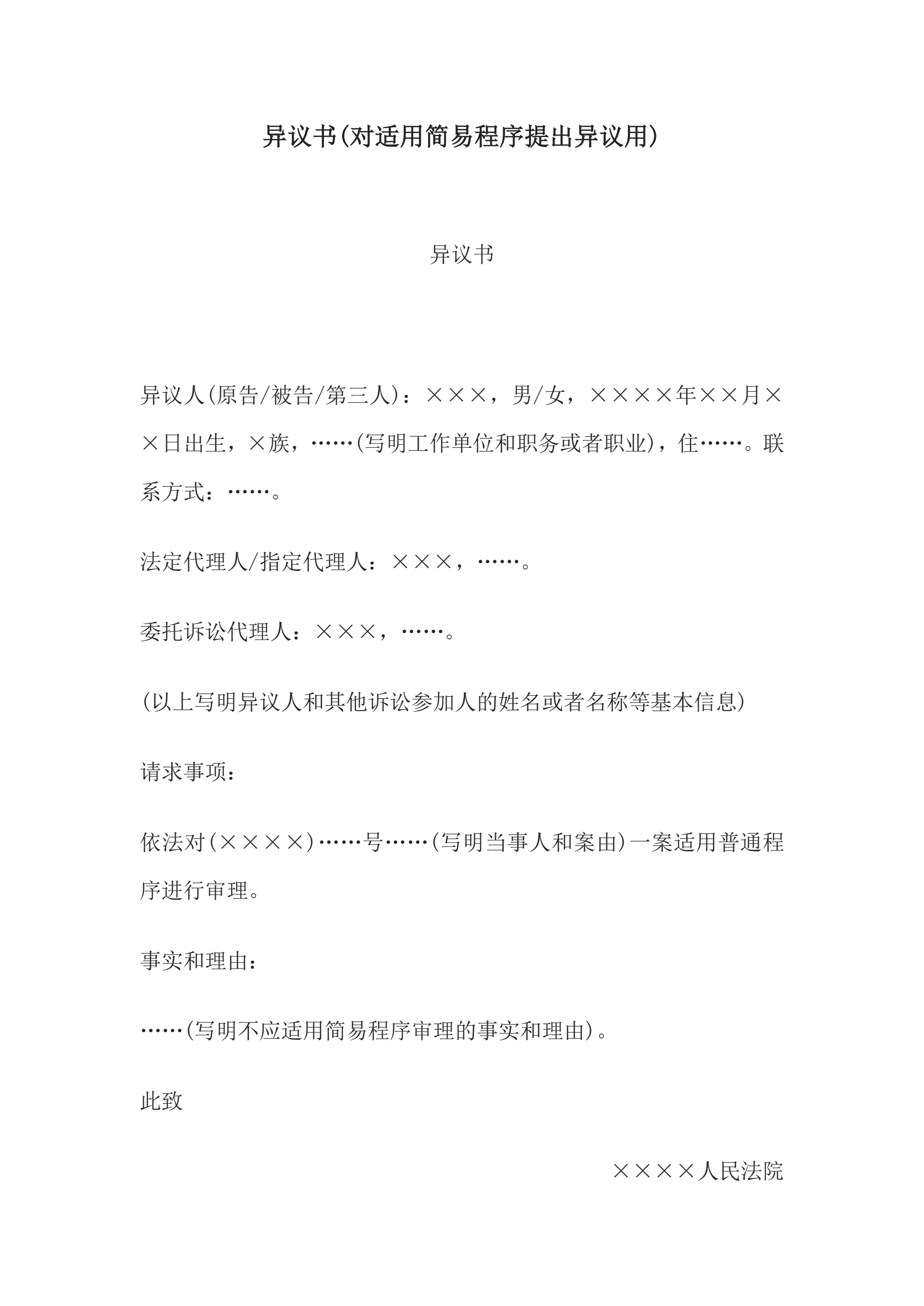 >异议书(对适用简易程序提出异议用)