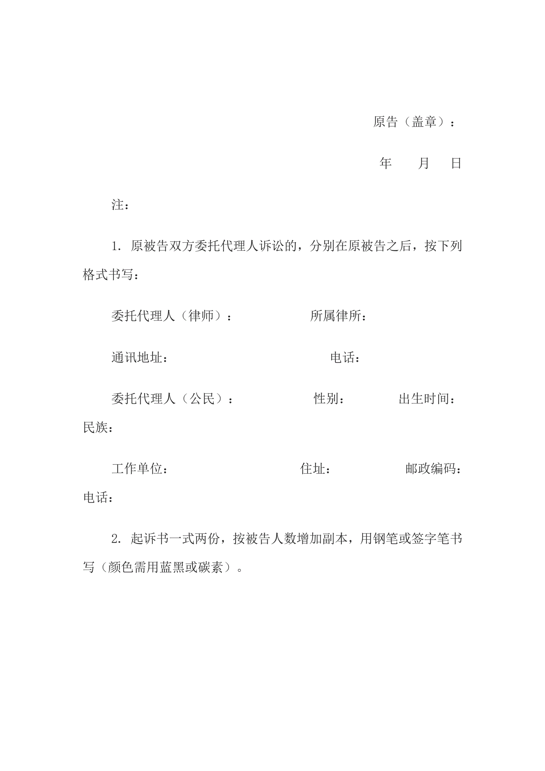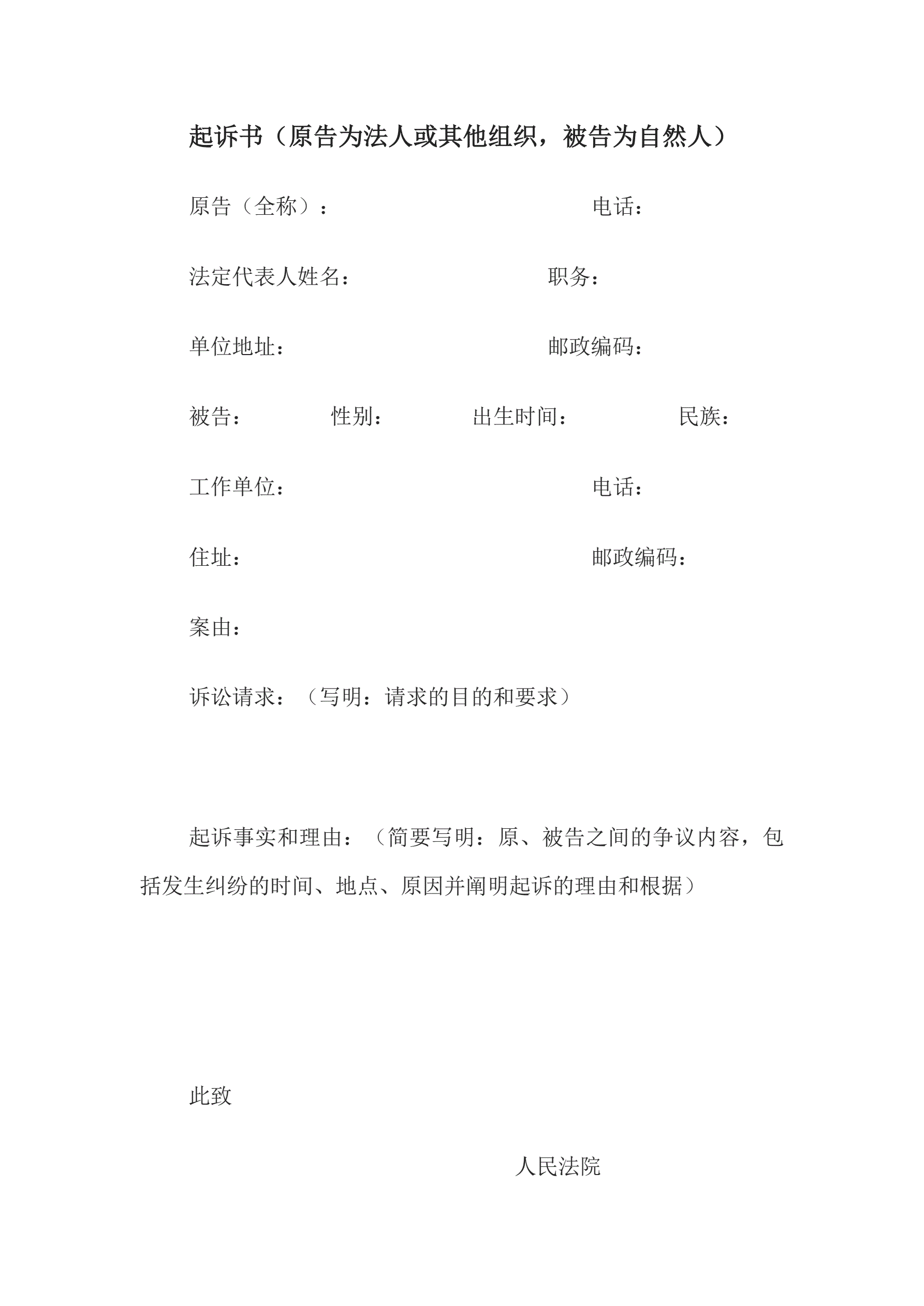 >起诉书(原告为法人或其他组织,被告为自然人)