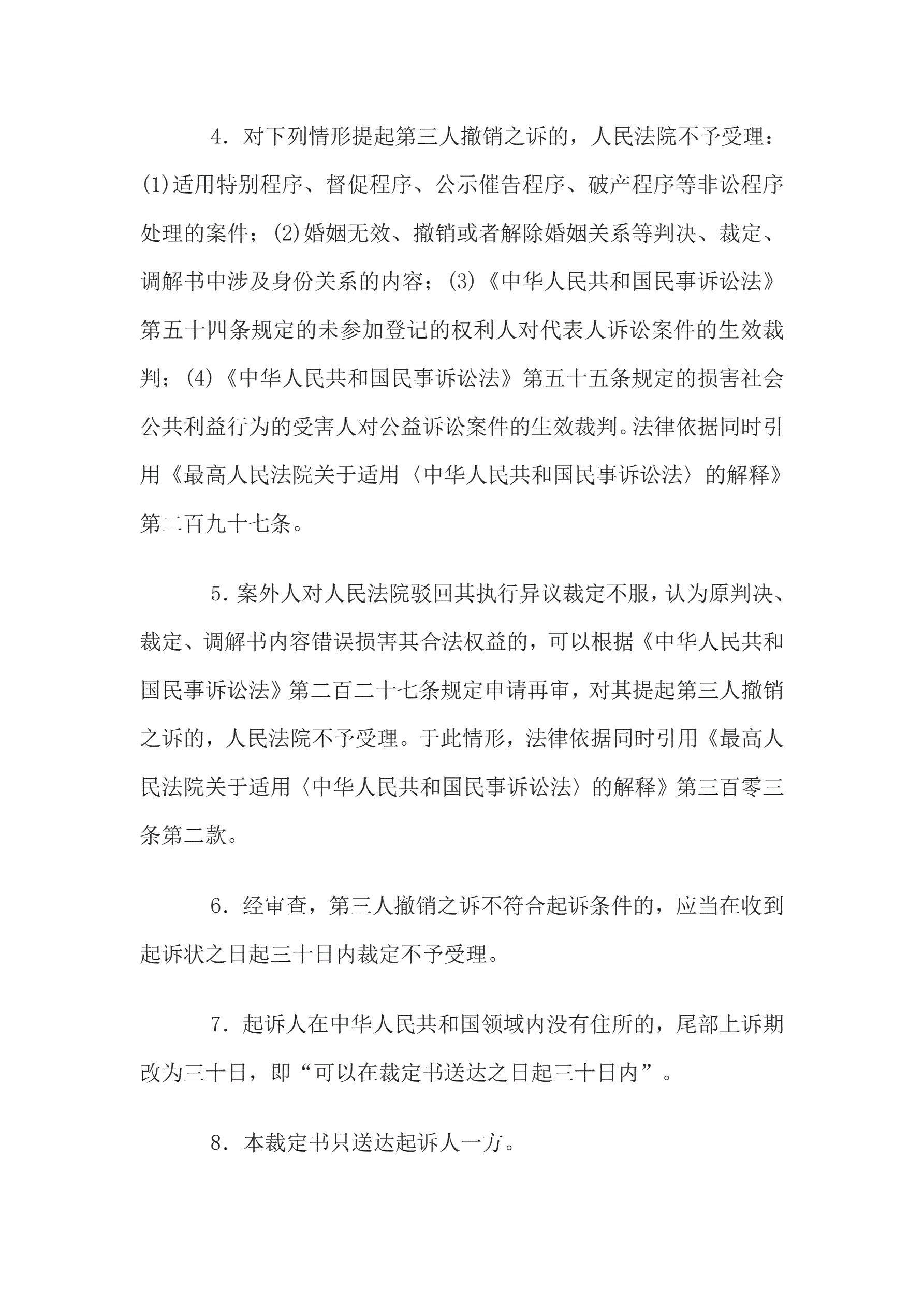 >民事裁定书(对第三人撤销之诉不予受理用)