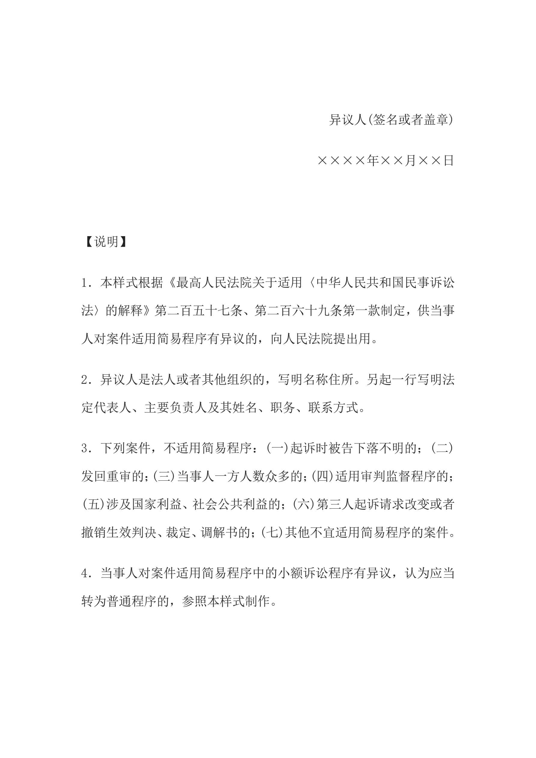 >异议书(对适用简易程序提出异议用)