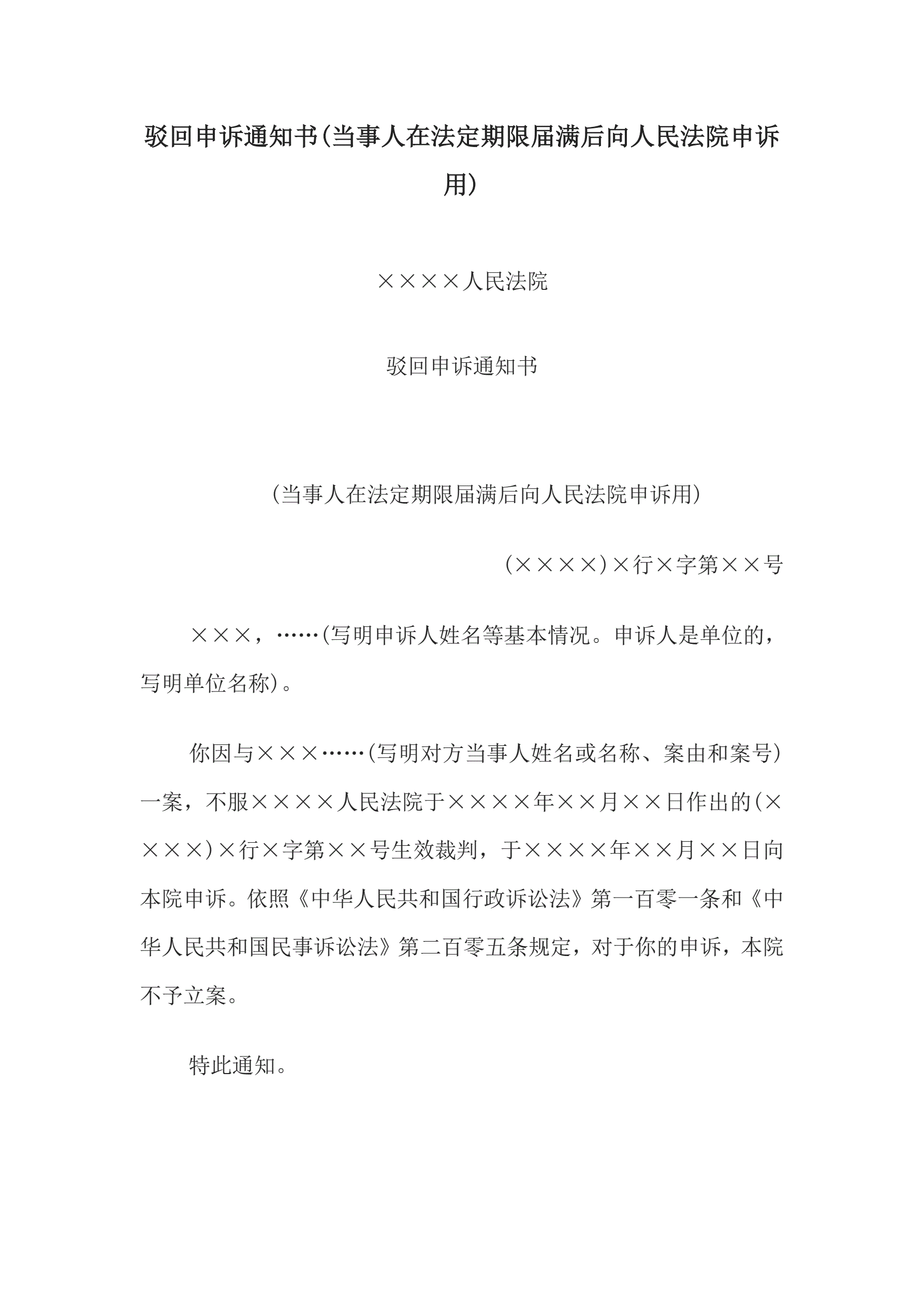 驳回申诉通知书(当事人在法定期限届满后向人民法院申诉用)