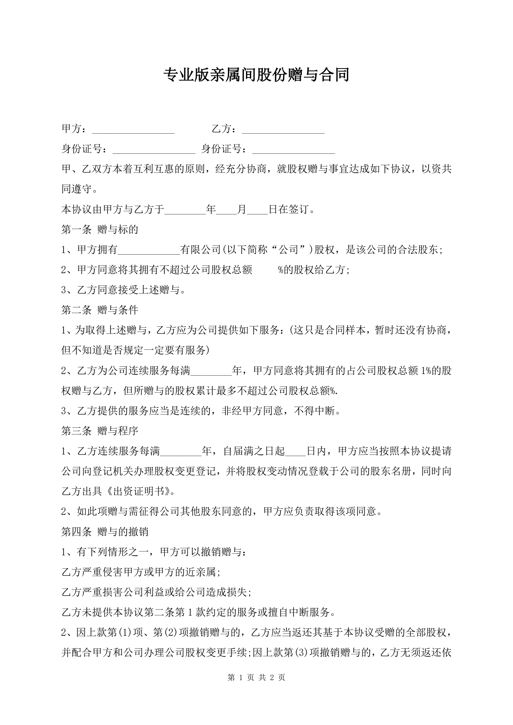 专业版亲属间股份赠与合同