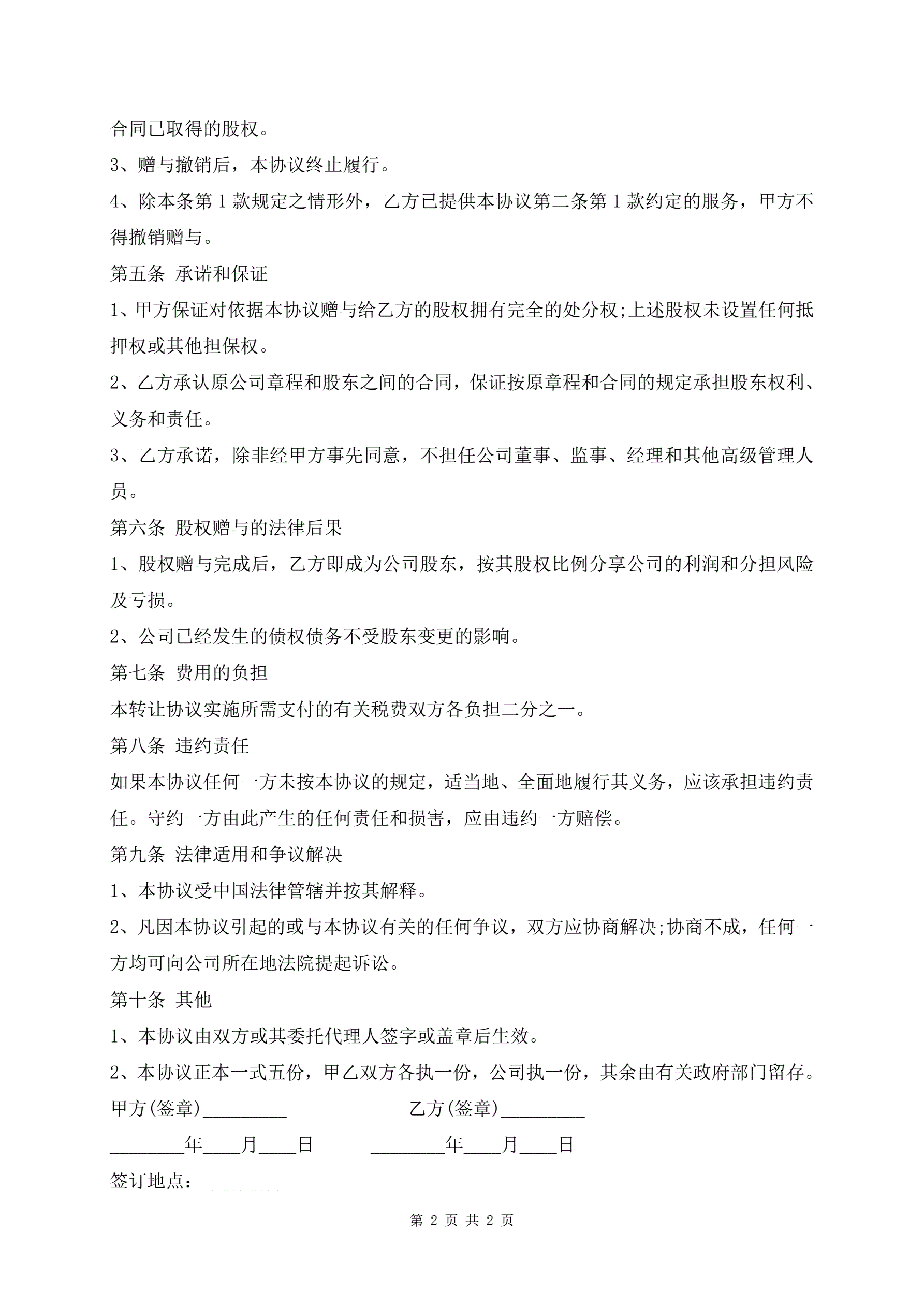 >专业版亲属间股份赠与合同
