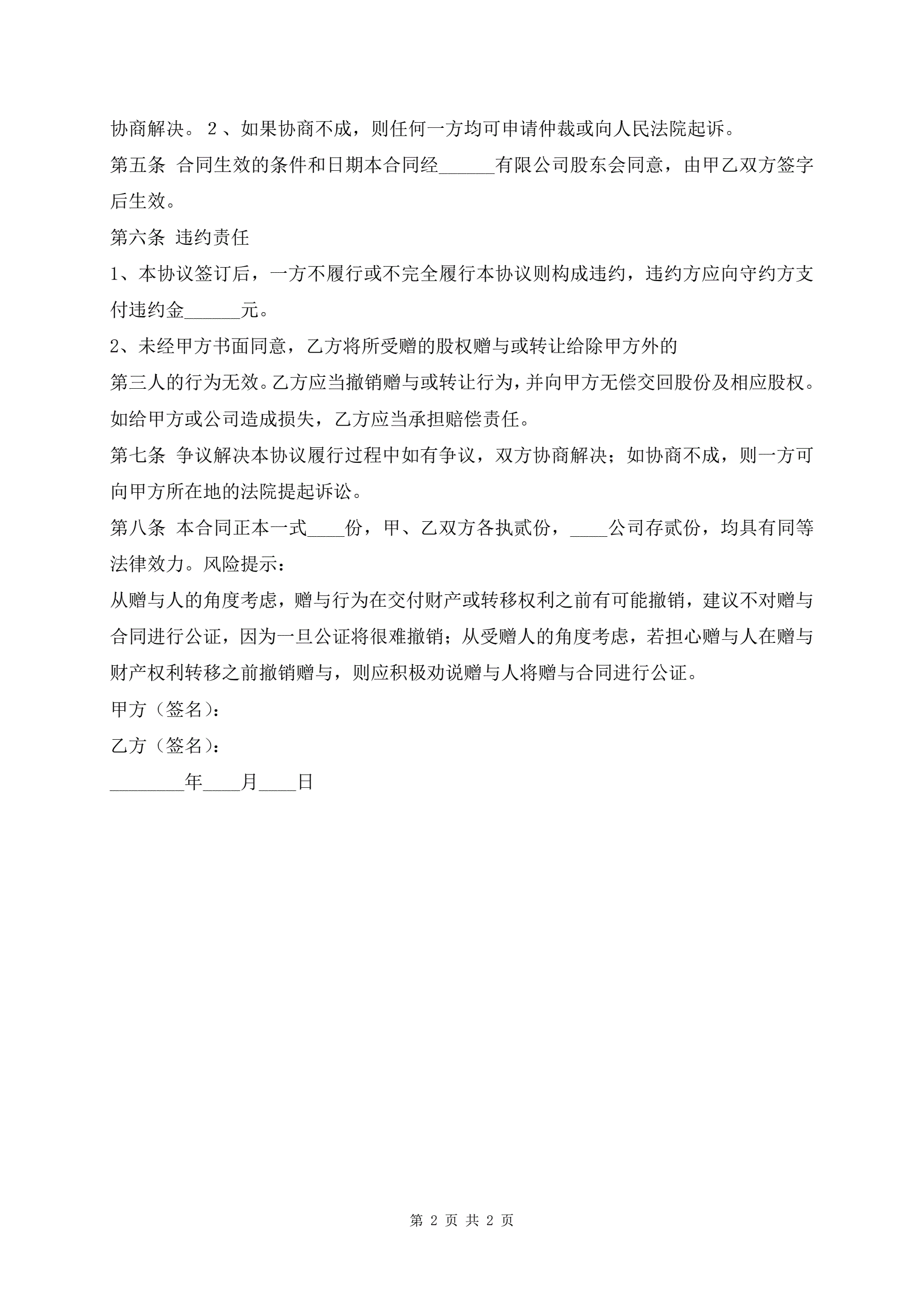 >最新股份赠与协议书范本