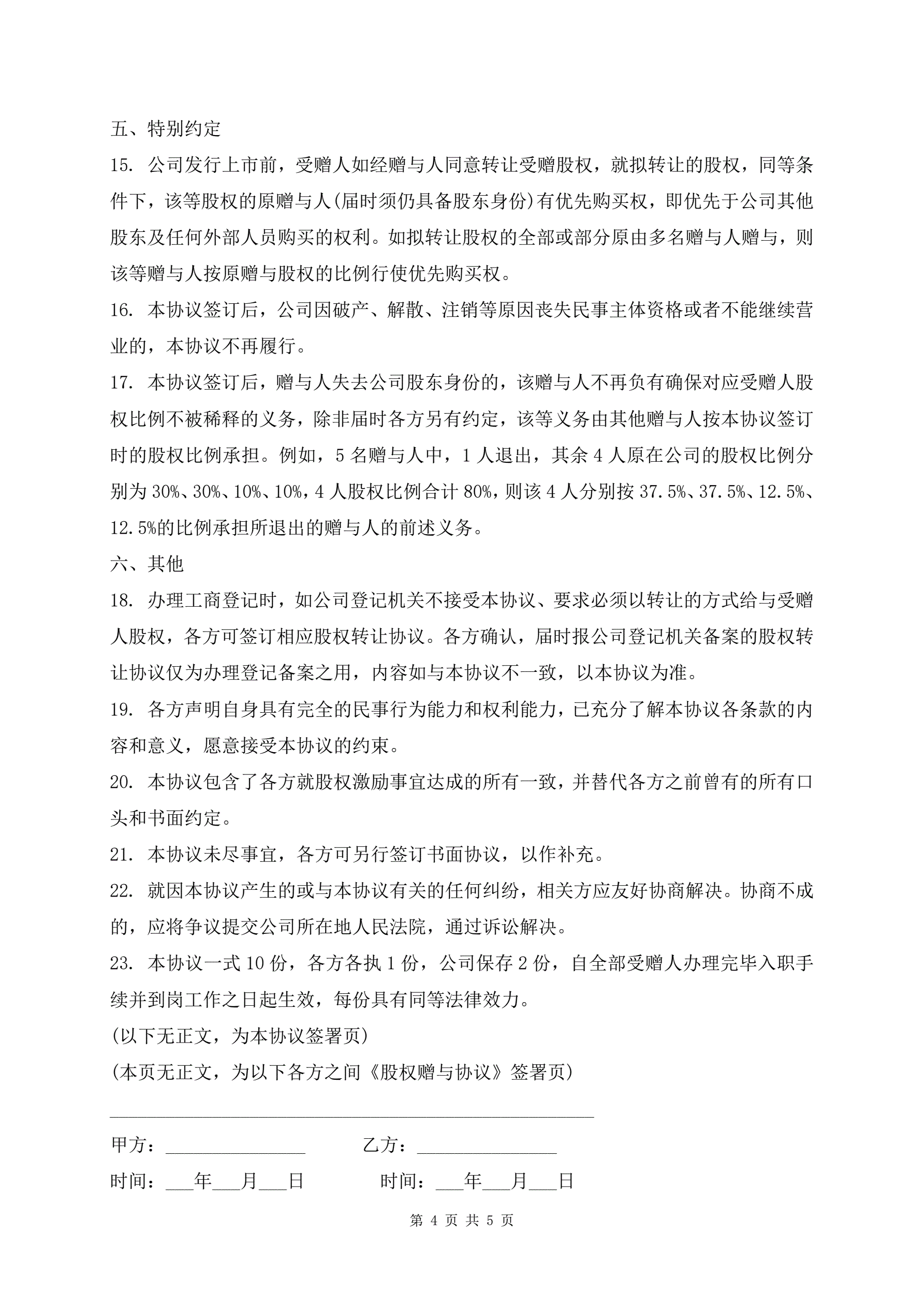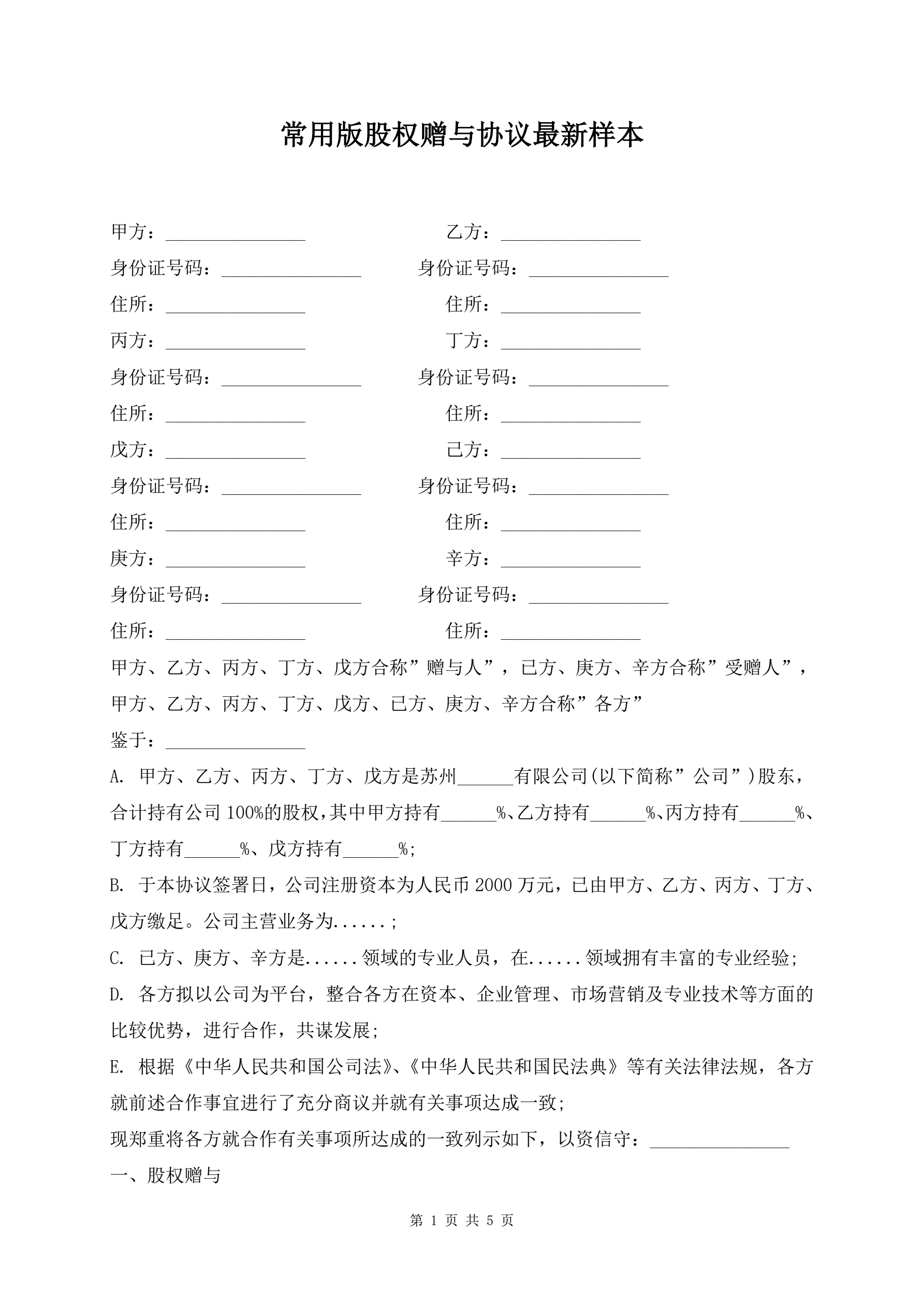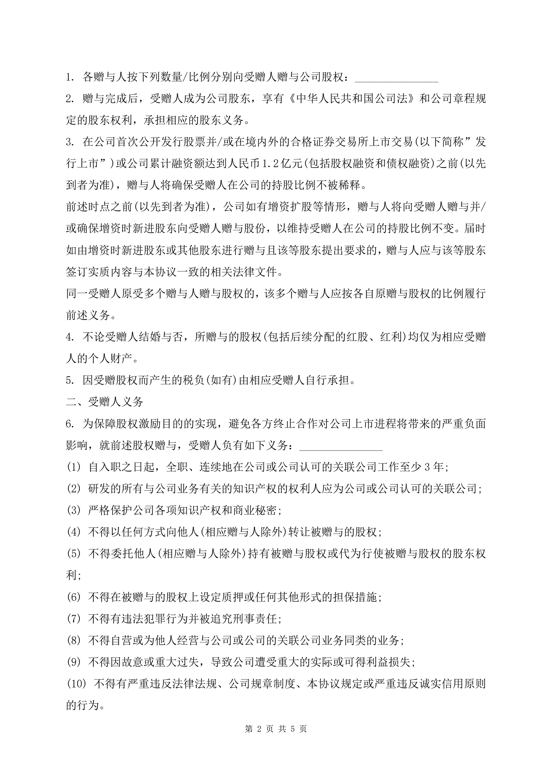 >常用版股权赠与协议最新样本