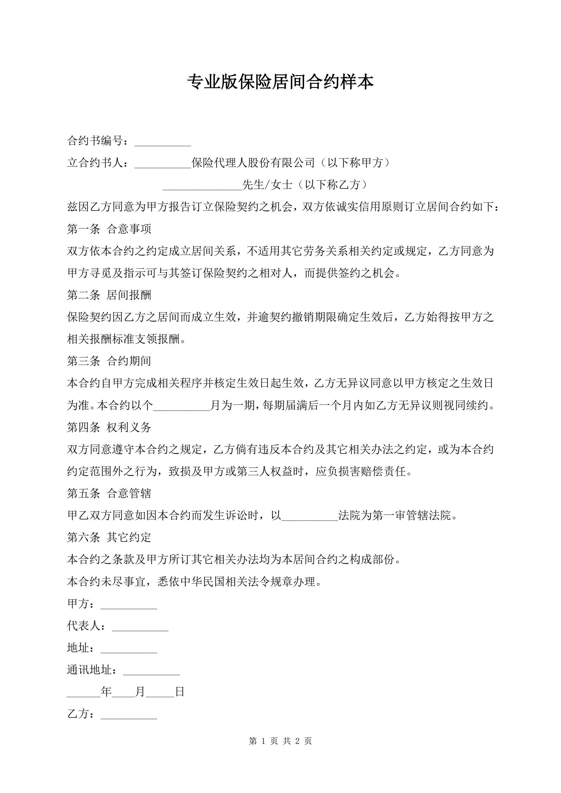 专业版保险居间合约样本