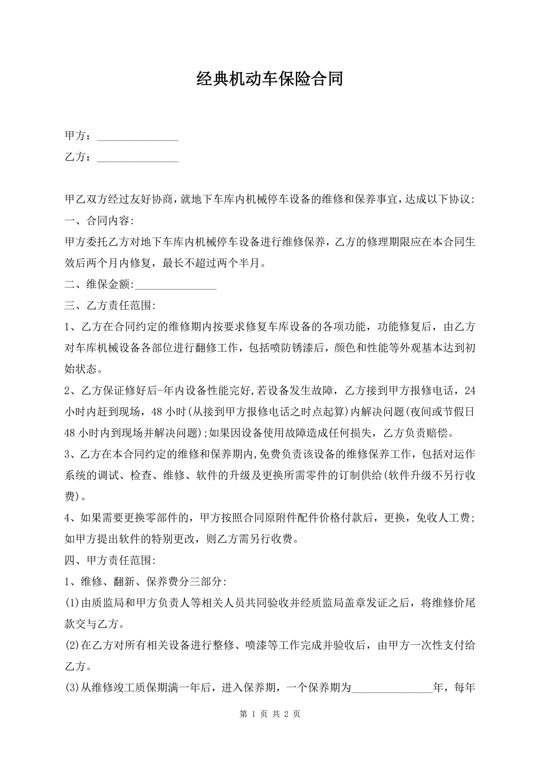 经典机动车保险合同