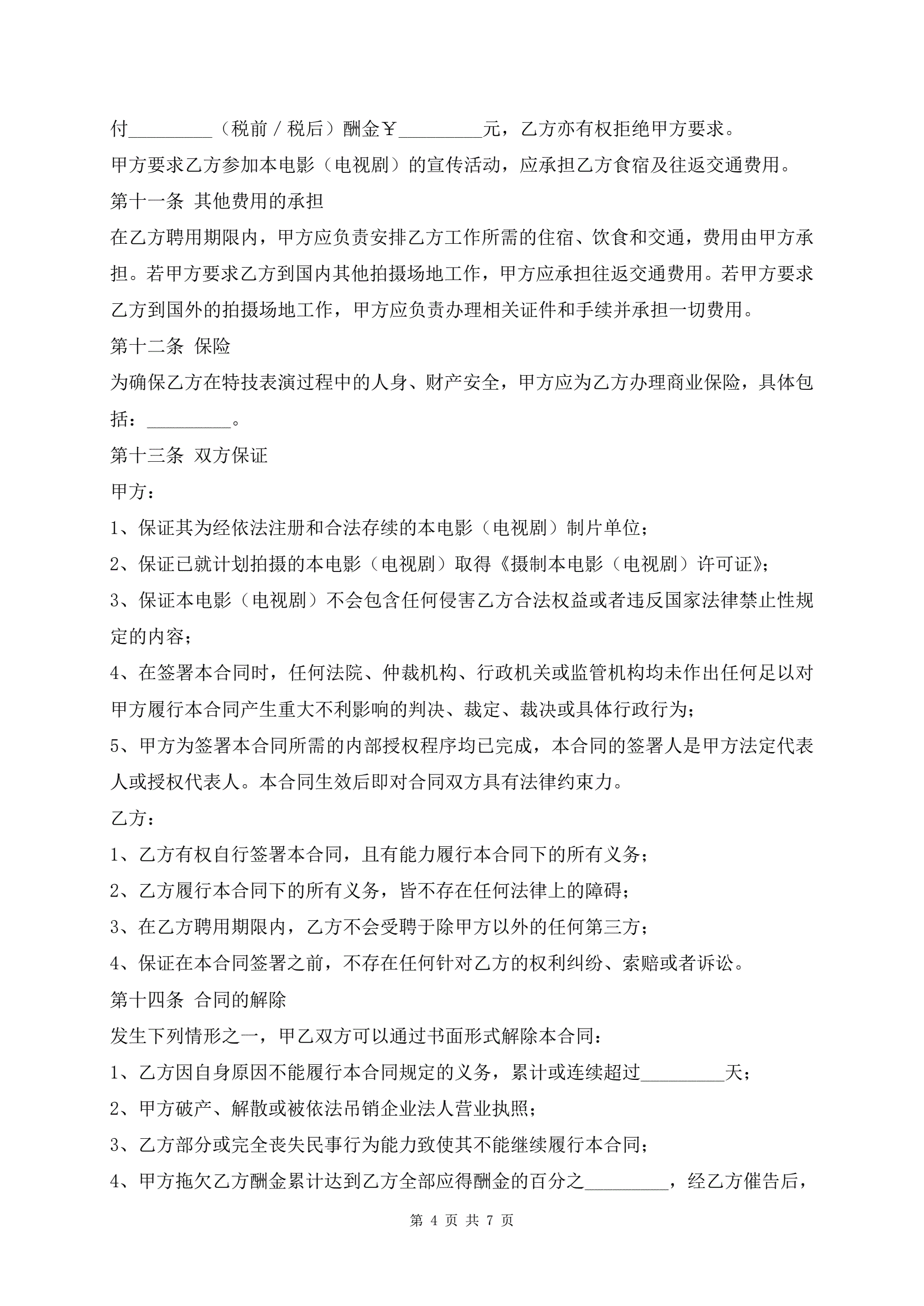 影视剧特技演员聘用合同通用版