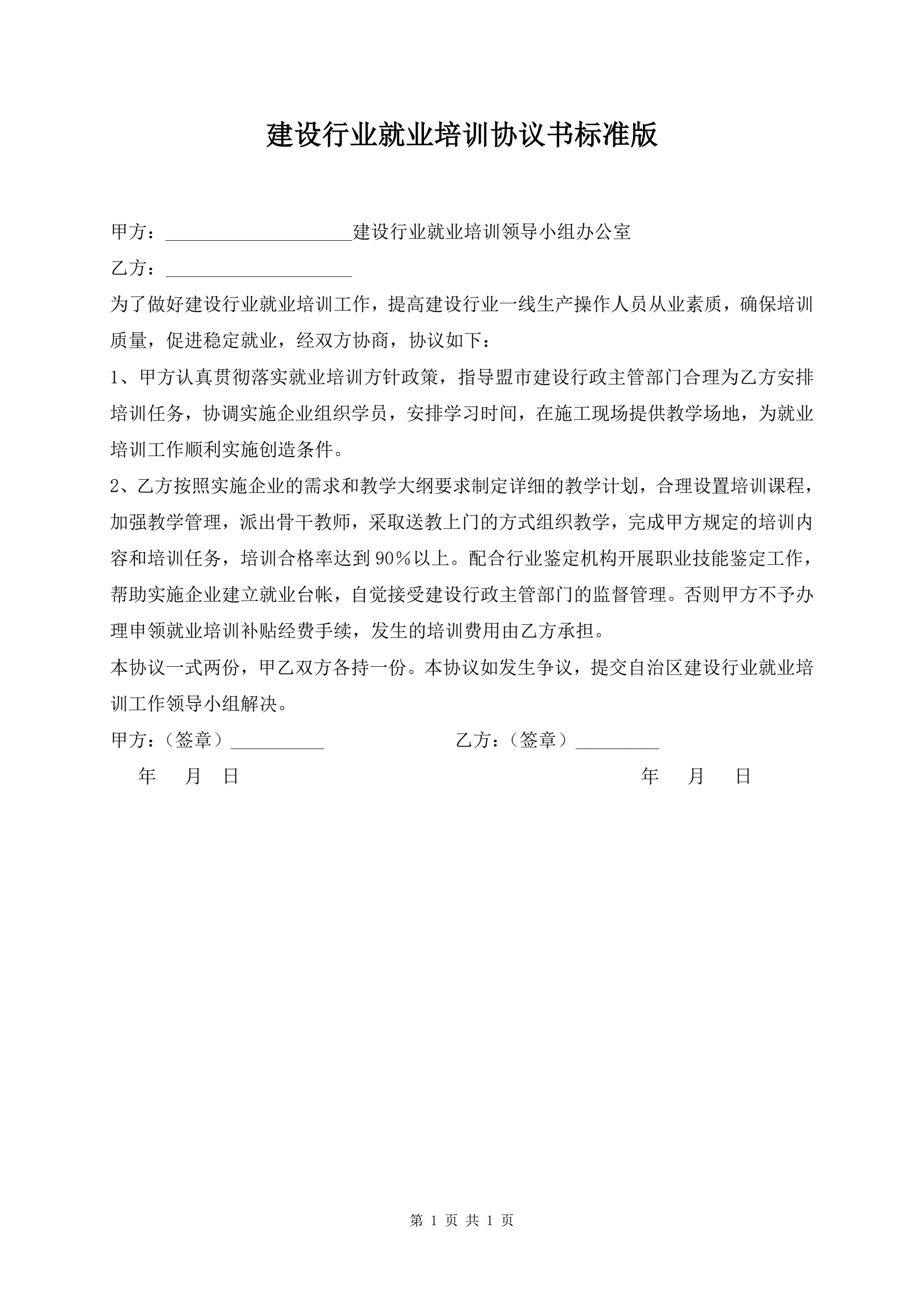 >建设行业就业培训协议书标准版
