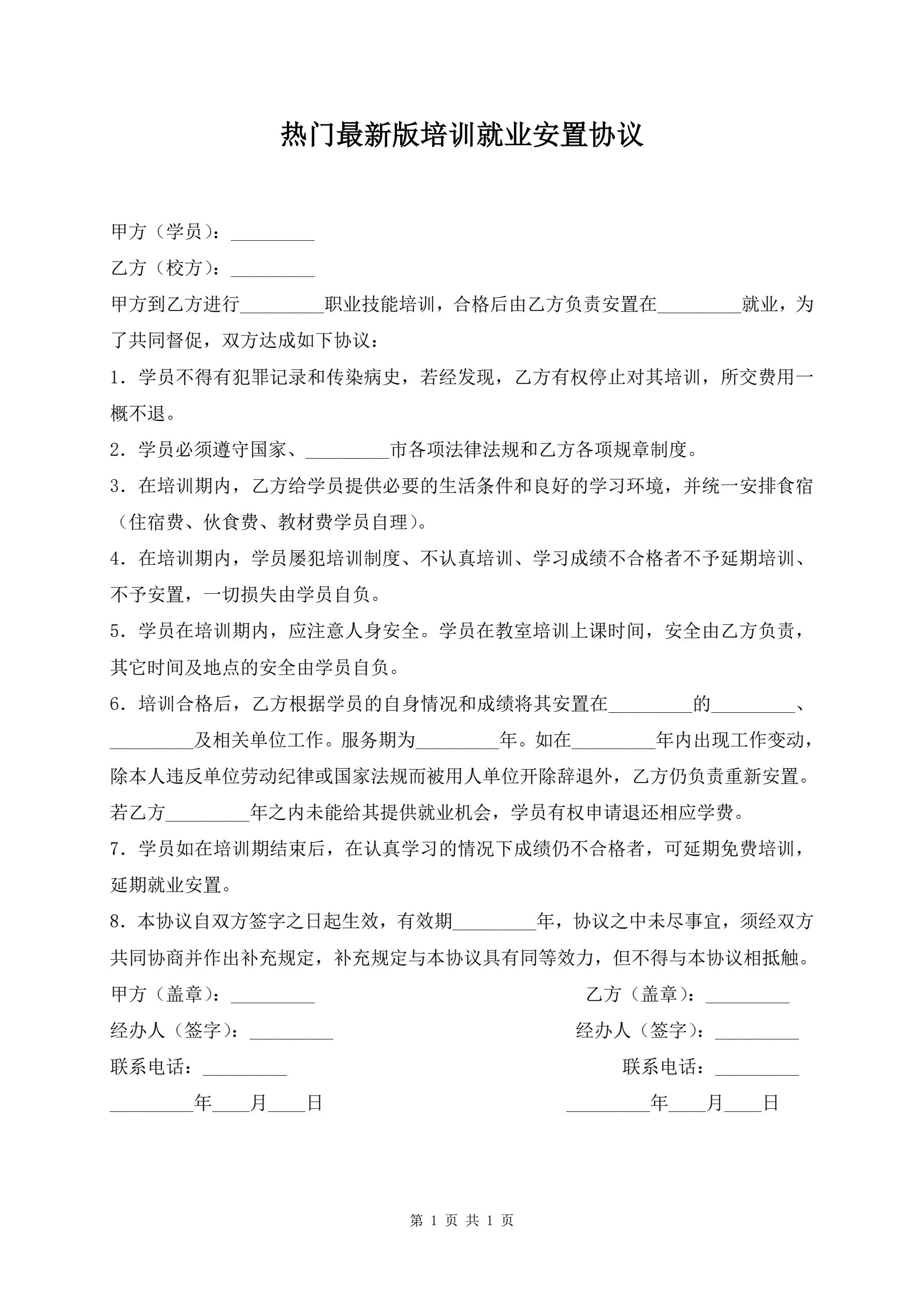 >热门最新版培训就业安置协议