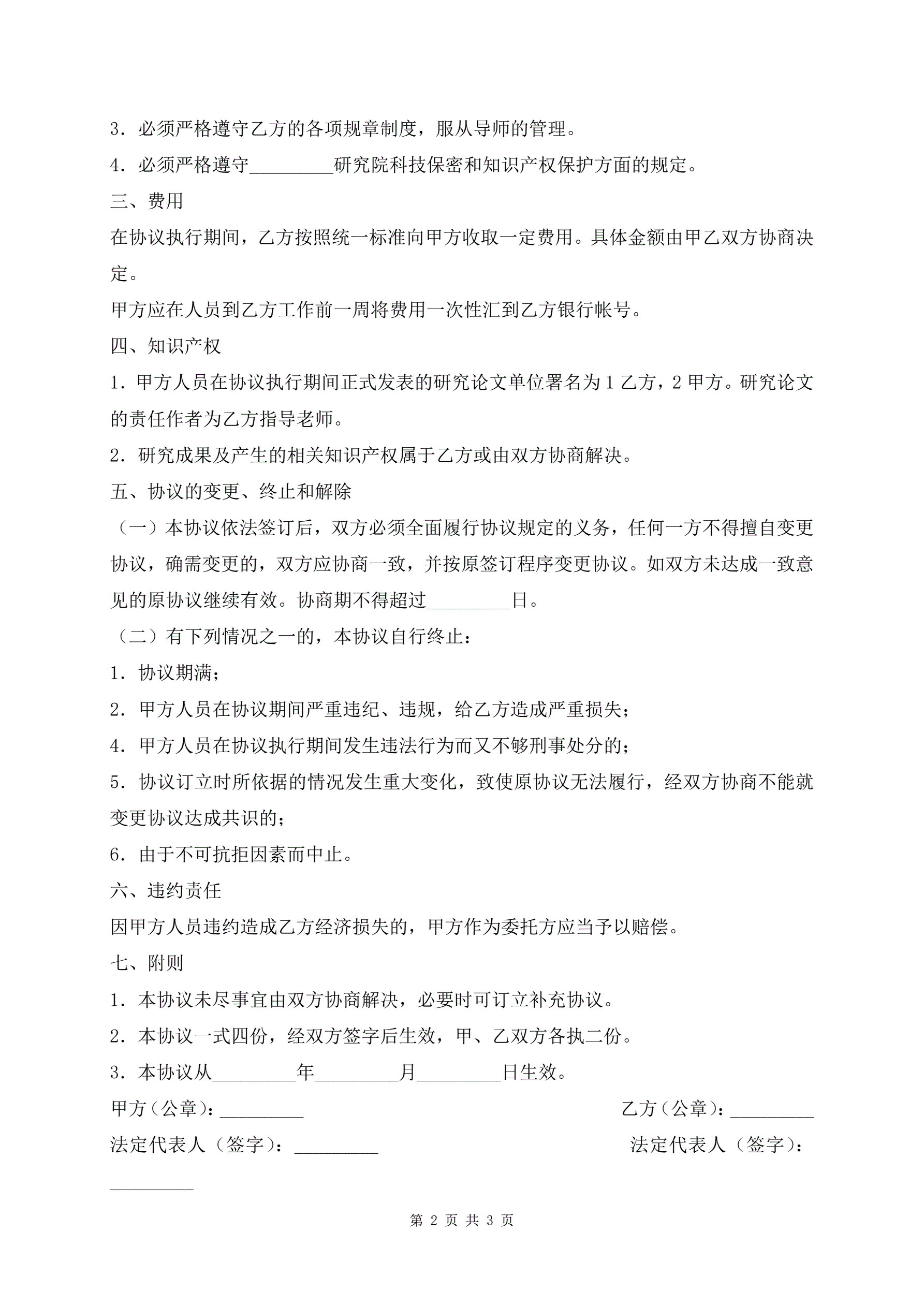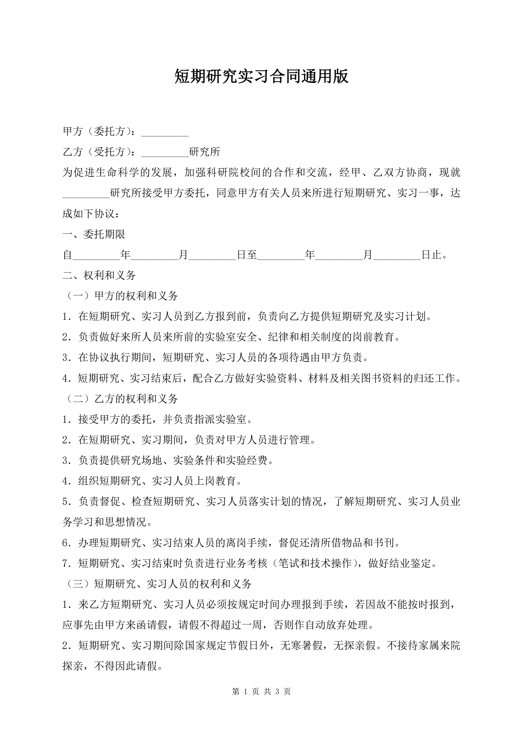 短期研究实习合同通用版