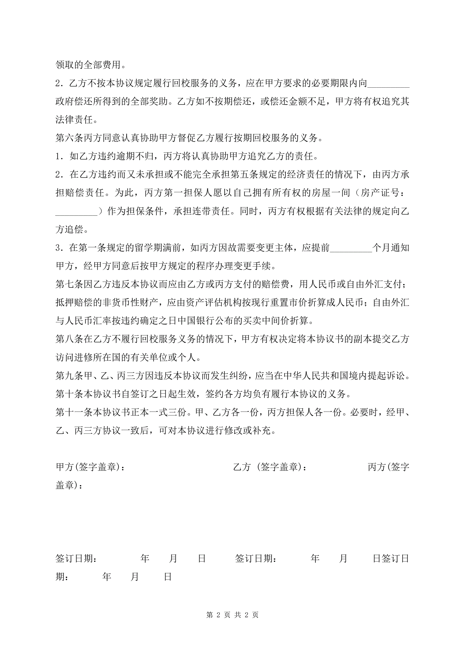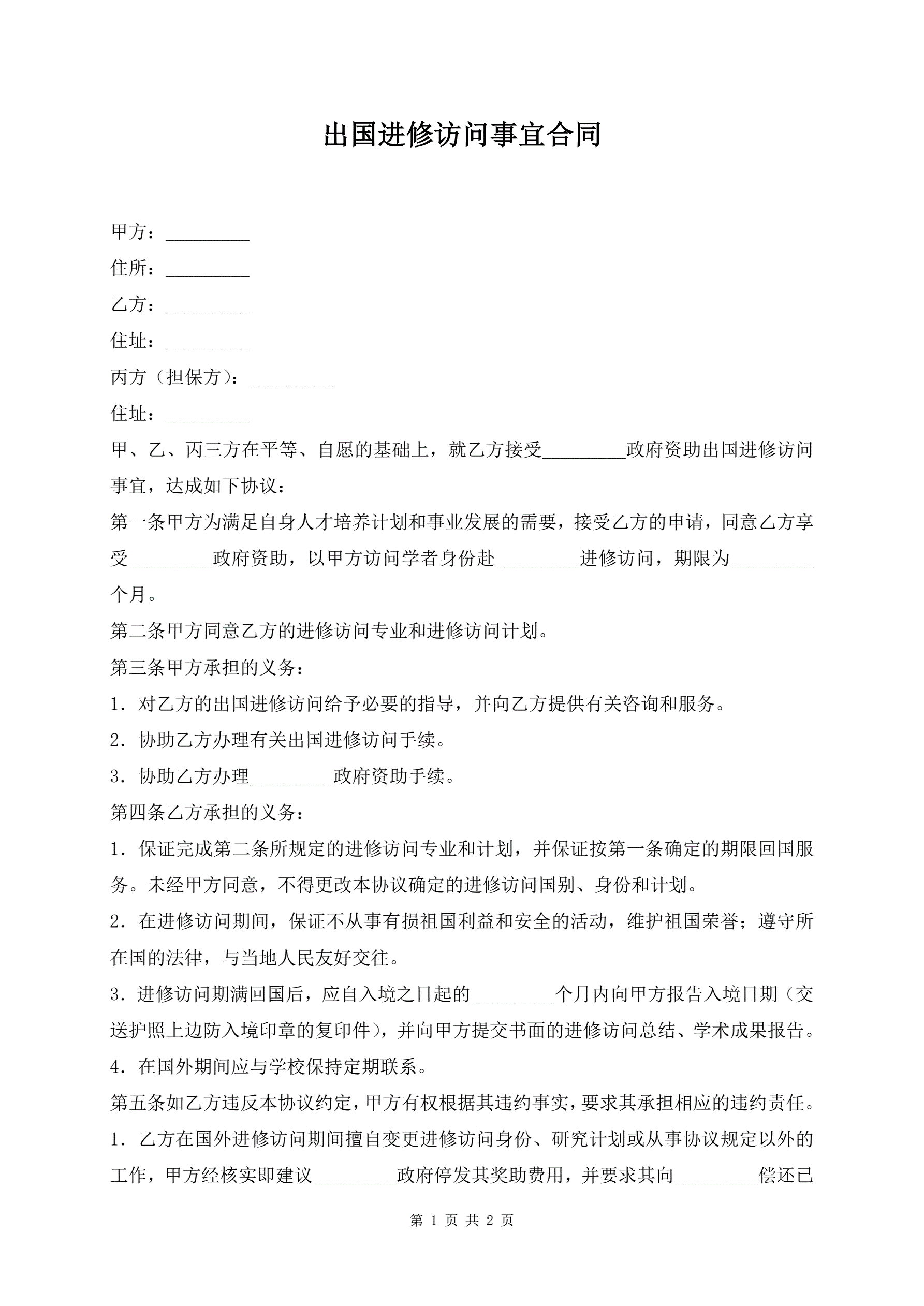 >出国进修访问事宜合同