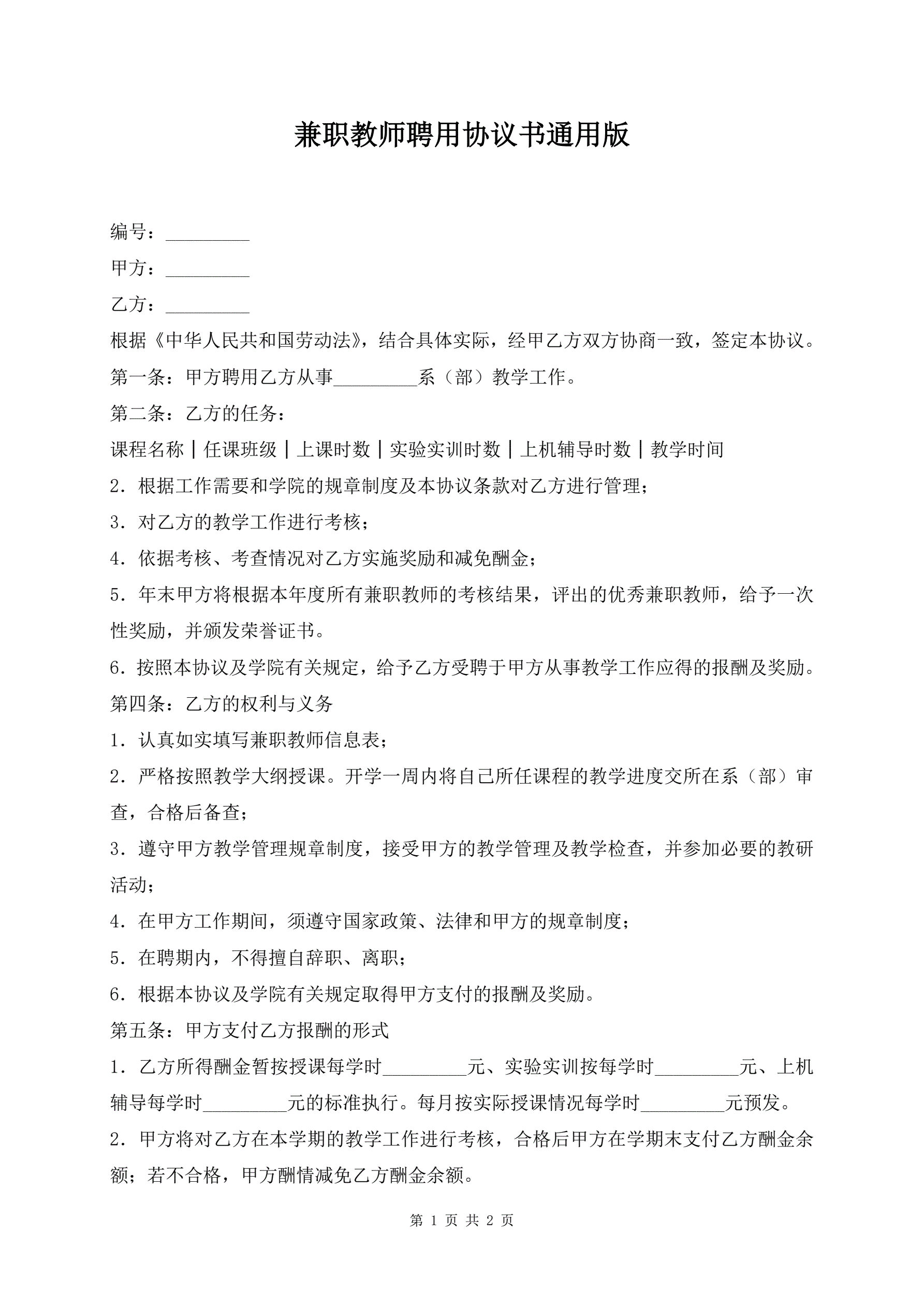 兼职教师聘用协议书通用版