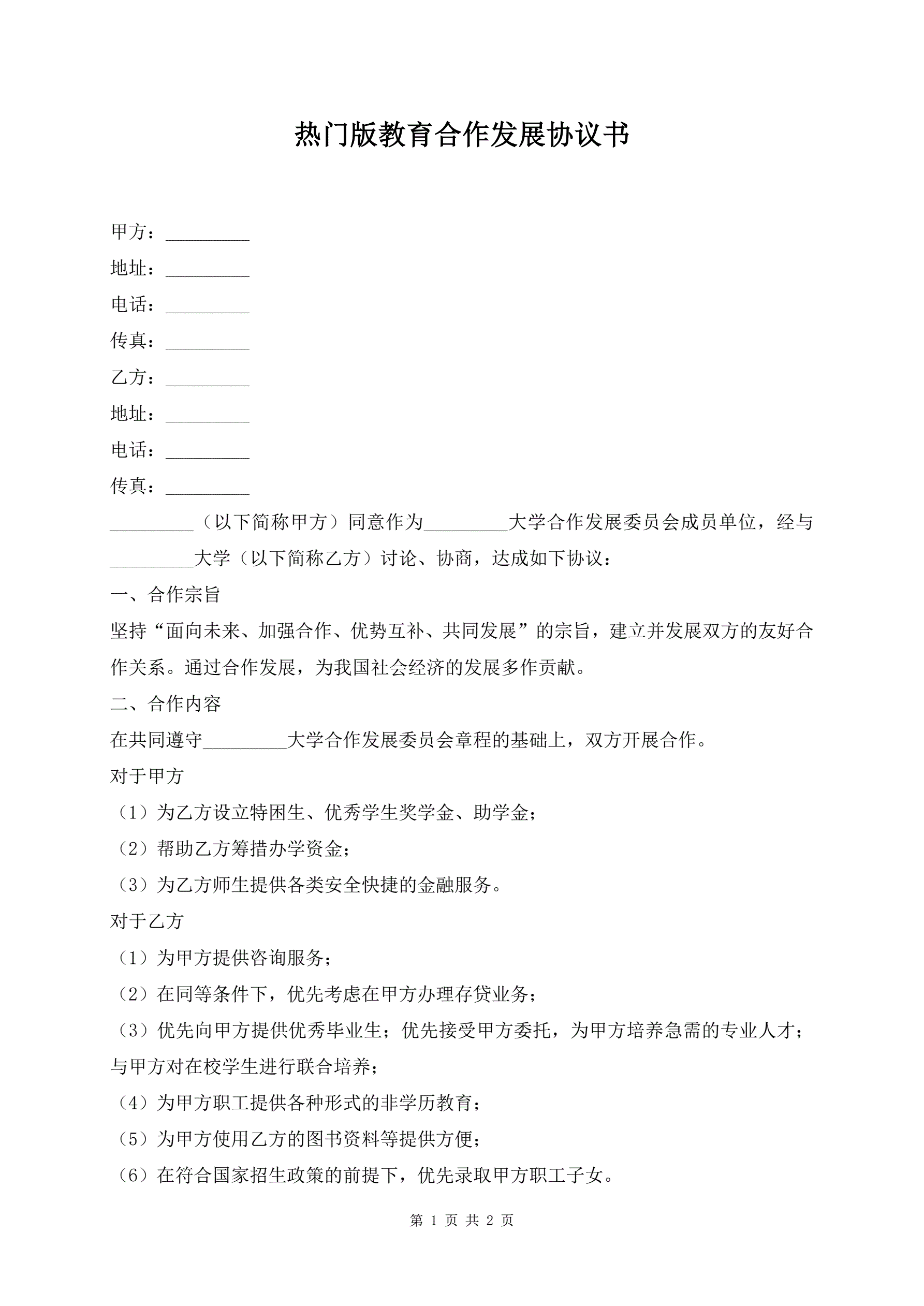 >热门版教育合作发展协议书