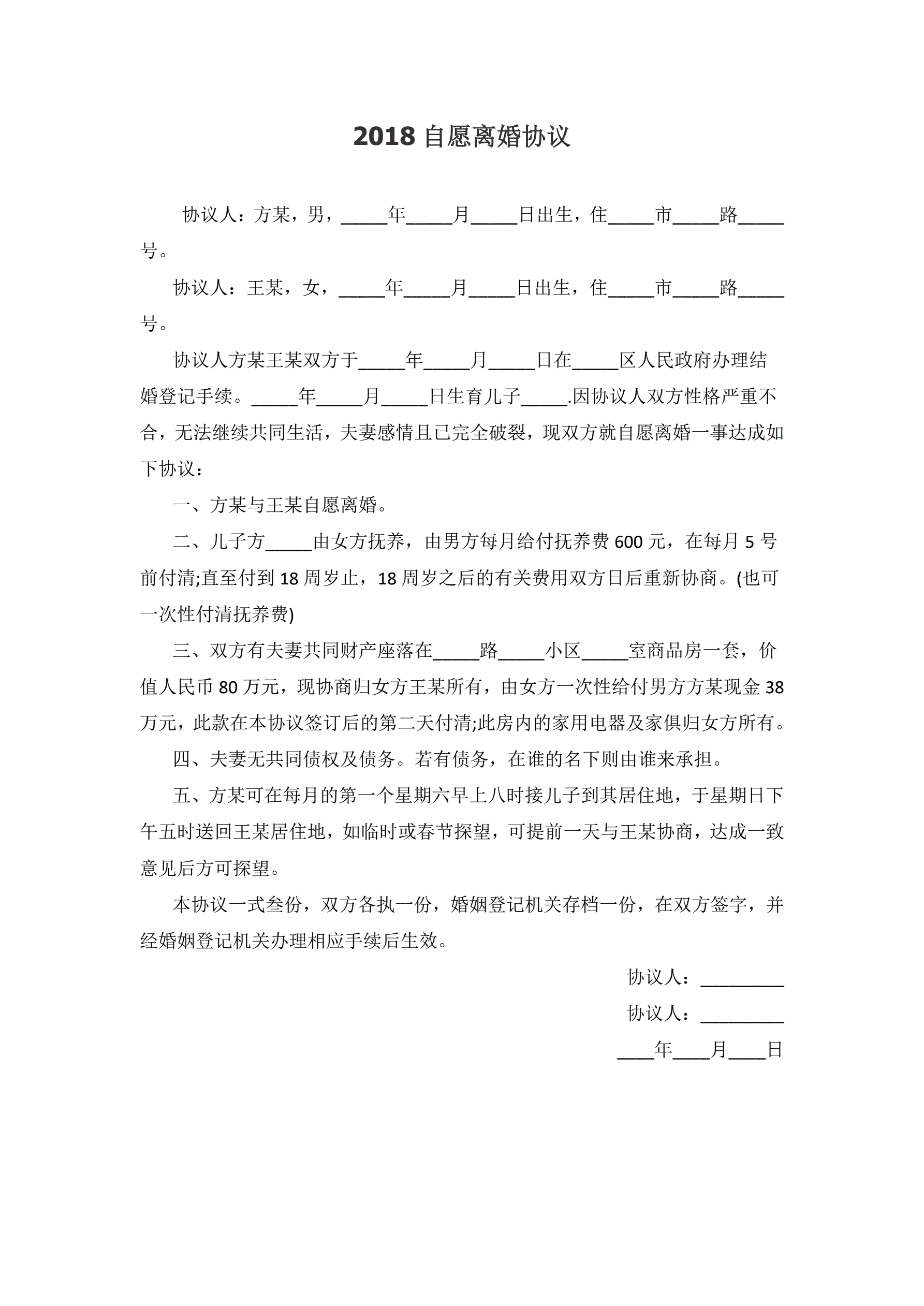 2018自愿离婚协议