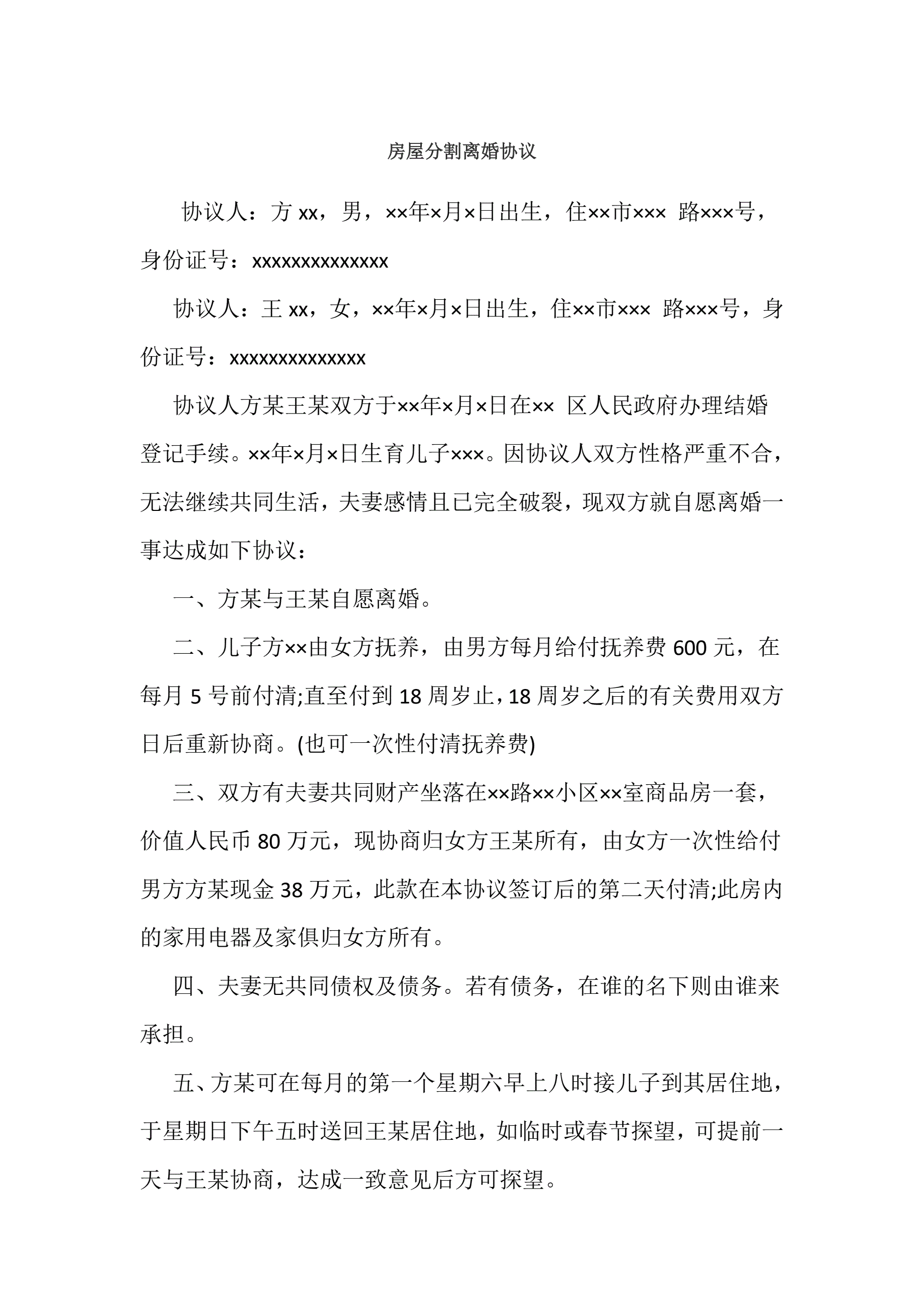 房屋分割离婚协议
