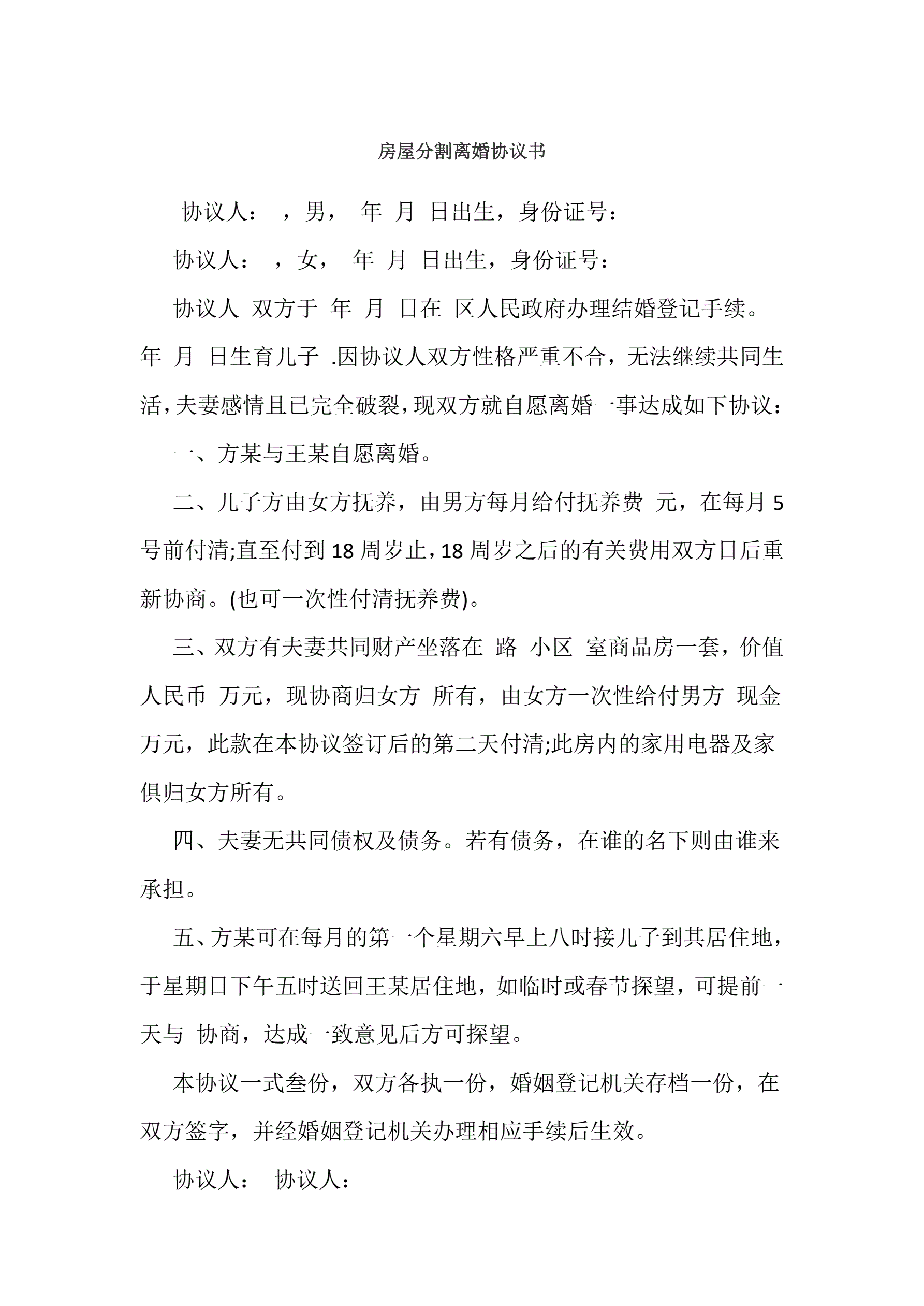 房屋分割离婚协议书