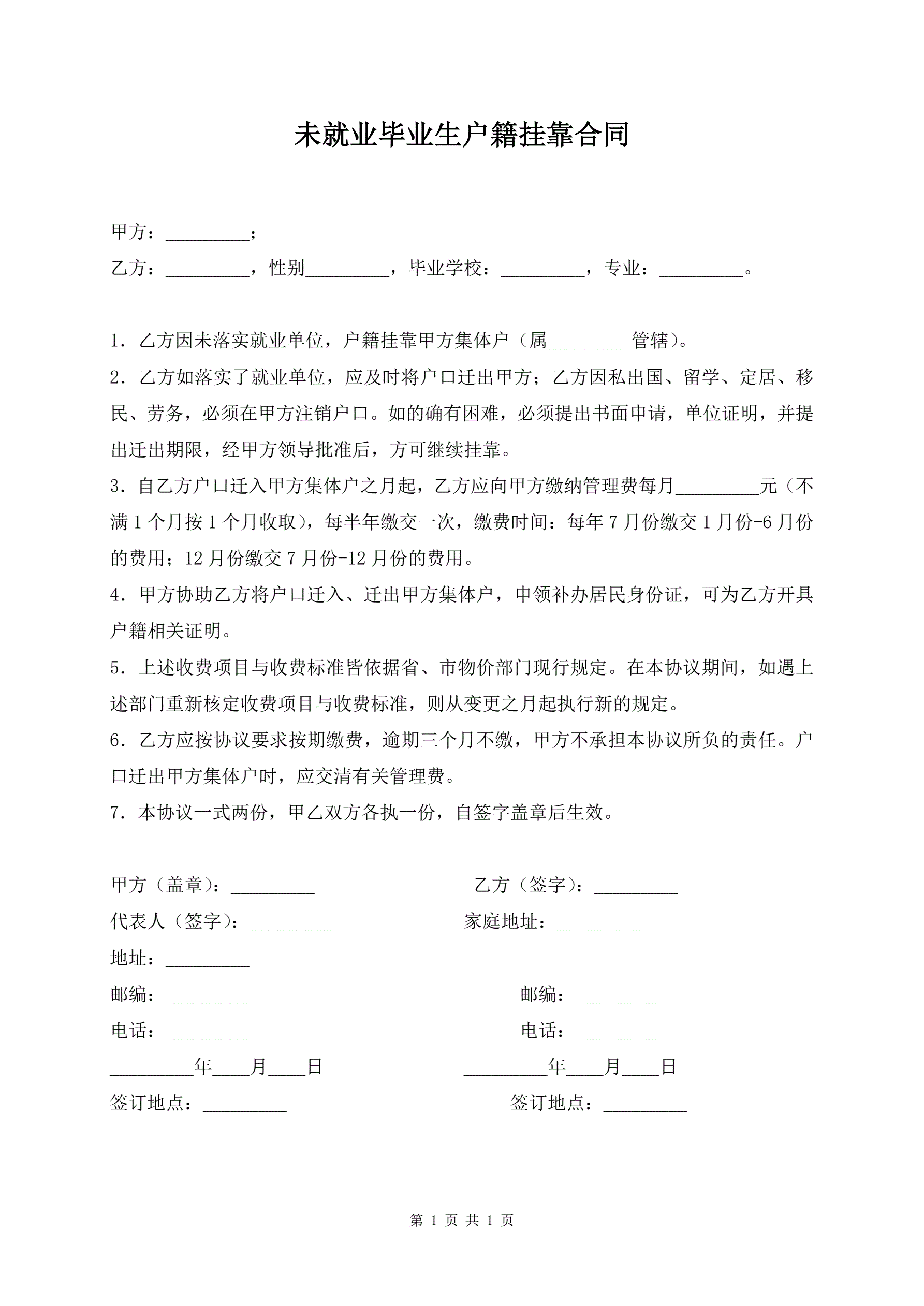 >未就业毕业生户籍挂靠合同