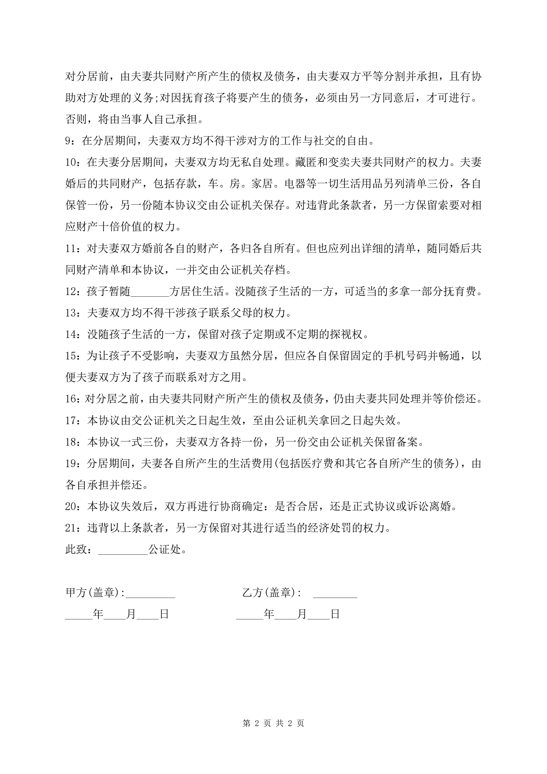 最新夫妻分居协议书常规版