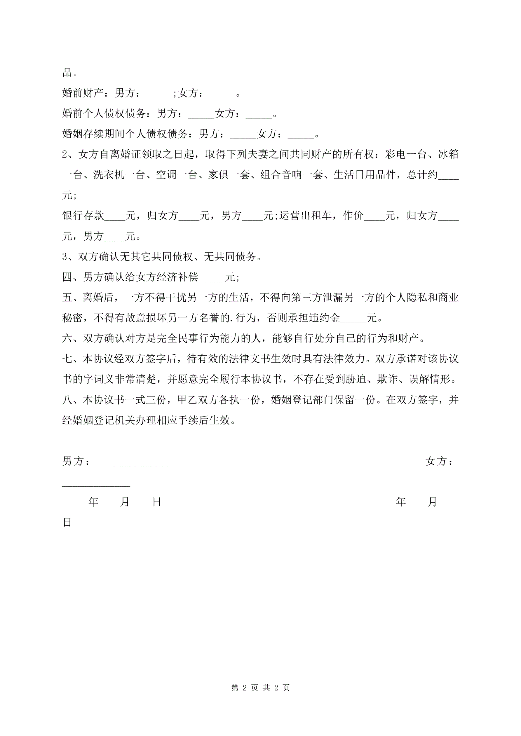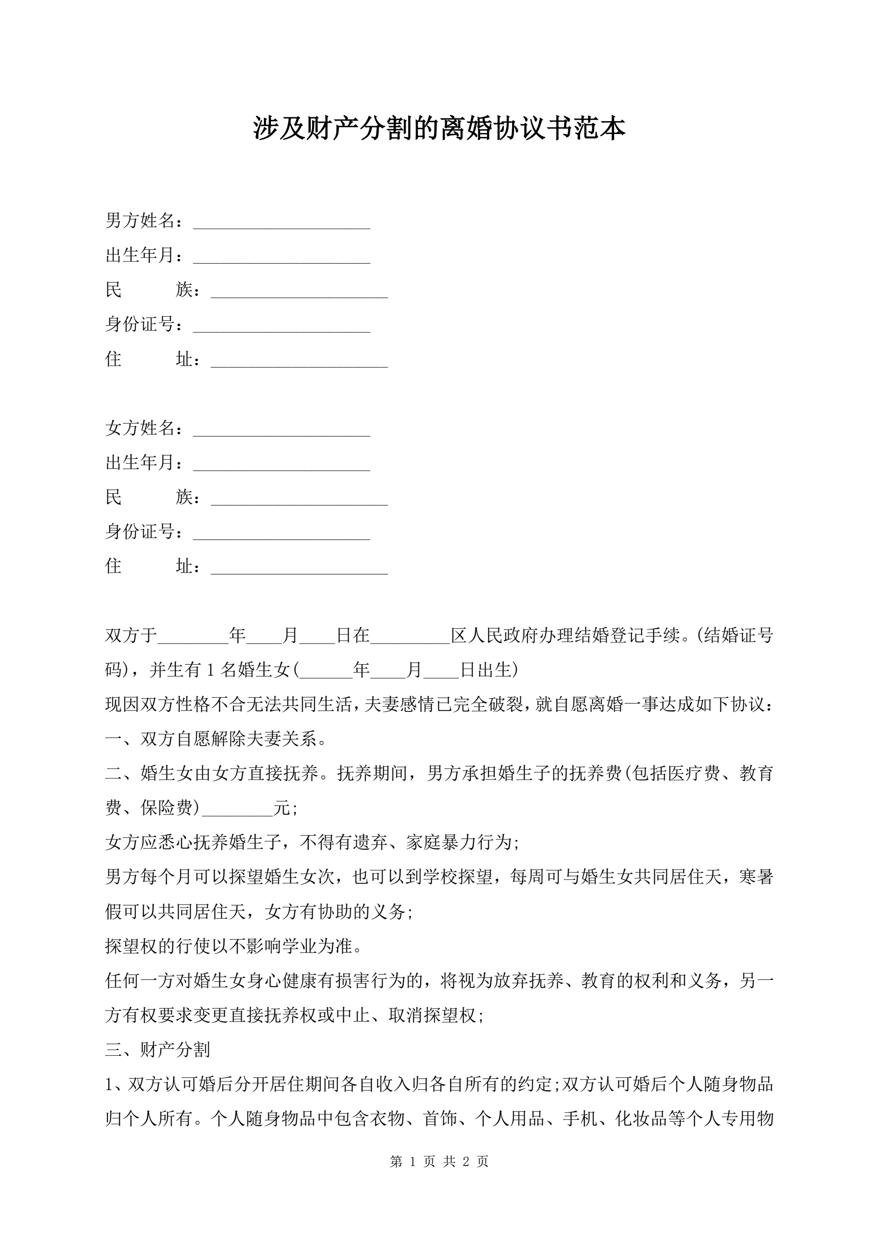 涉及财产分割的离婚协议书范本